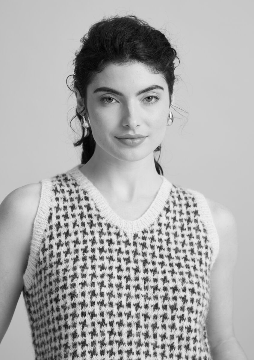 Elwood ist eine stilvolle Weste mit V-Ausschnitt und auffälligem Hahnentrittmuster, gefertigt aus zwei kontrastierenden Farben weicher Alpaka-Baumwolle. Mit ihrem hohen gerippten Saum und Ausschnitt eignet sie sich perfekt zum Kombinieren oder als Statement-Stück für sich allein.