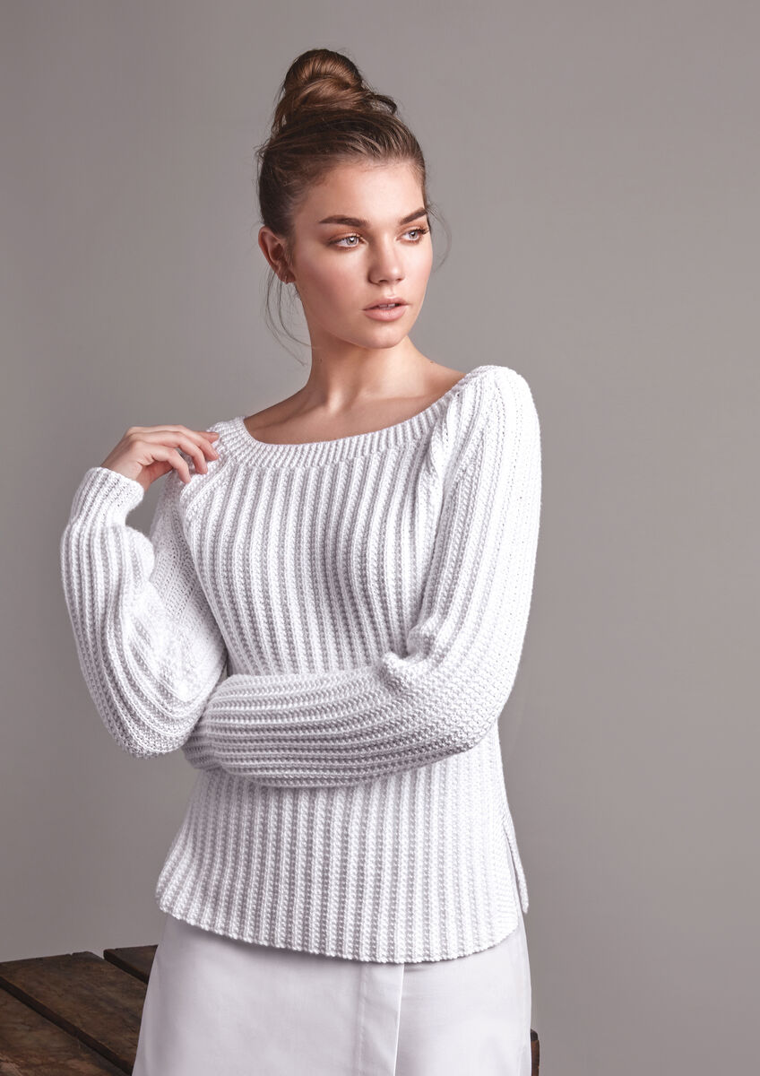 This comfortable yet stylish jumper features a lovely rib pattern, split hem and raglan sleeves. It is knitted in our 100% cotton yarn Handknit Cotton and was designed by Kim Hargreaves.