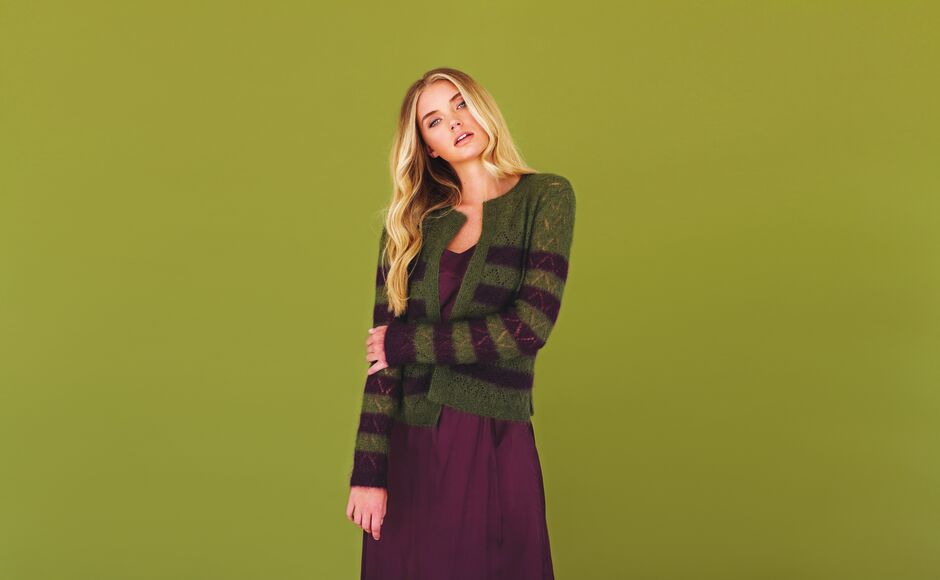 Knit this beautiful lacey cardigan. The elegant garment is knitted in our super soft Kidsilk Haze yarn and features horizontal stripes. This is pattern is only available in Kim Hargreaves book "Bitter". Check your local stockist to buy it!
