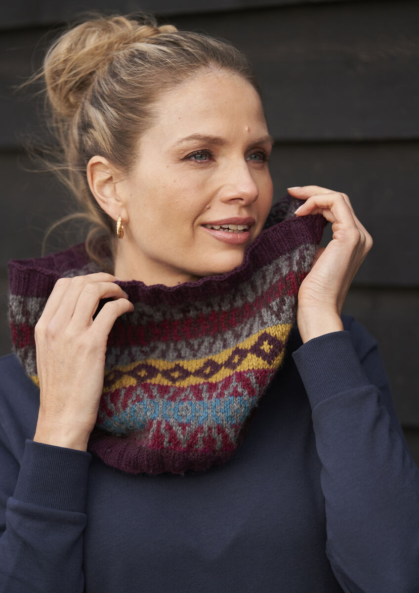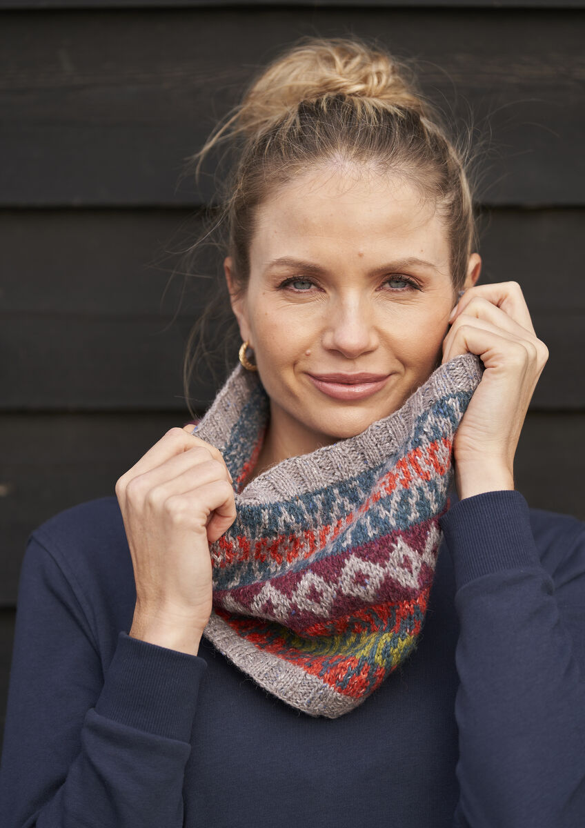 This colourful, Fair Isle accessory is knitted in the round for a seamless finish, using the wonderful Felted Tweed. Choose from three Felted Tweed colourways or there is also an option to knit it in Alpaca Soft DK – the choice is yours!