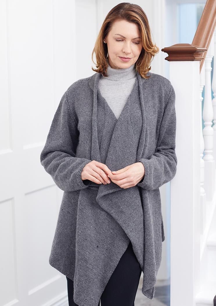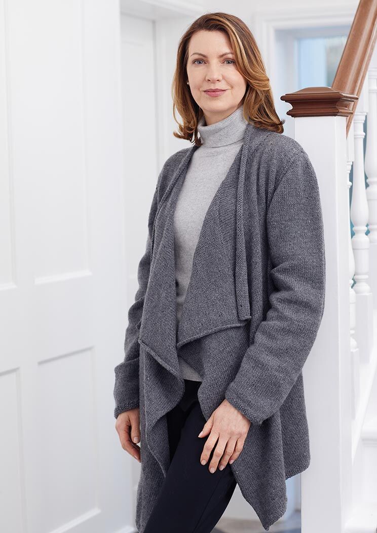 Knit this longline cardigan with waterfall style front, a design by Quail Studio.