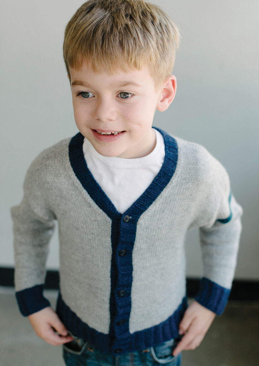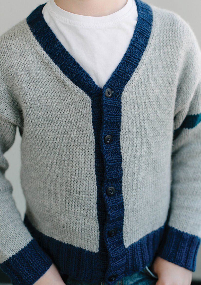 Knit this lovely kids cardigan which features a V-neck shaping and contrast colour ribs and button band. It is knitted in stocking stitch and uses two shades of Alpaca Soft DK, a lovely blend of 70% virgin wool and 30% alpaca. It was designed by Jen Geigley.