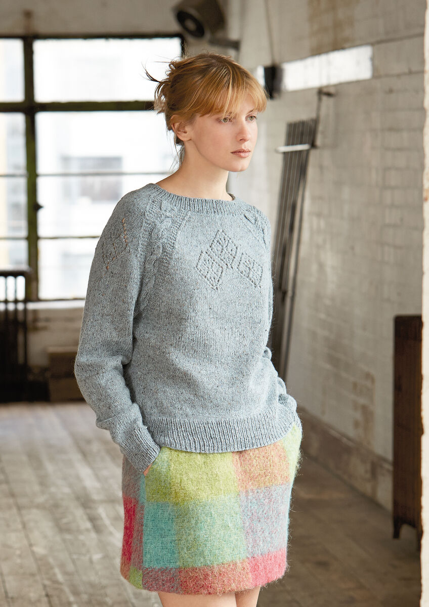 Knit this ladies long sleeved sweater from Rowan Knitting & Crochet Magazine 58, a design by Marie Wallin using the gorgeous yarn Felted Tweed (wool.) With cable details along the raglan edge and placement lace detailing, this knitting pattern is suitable for the experienced knitter.