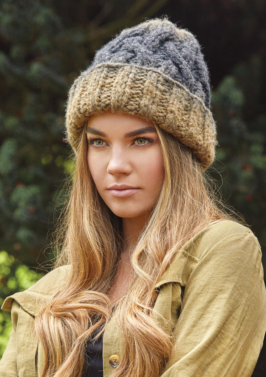 Knit this accessory hat from Closer, a design by Kim Hargreaves using the beautifully soft yarn Brushed Fleece (wool, alpaca and polyamide.) This super cosy, textured hat has a deep rib turnback brim.