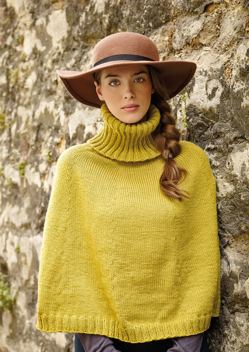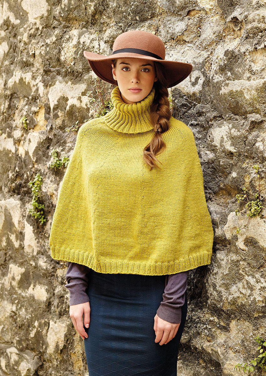 Knit this womens stocking stitch cape from the Simple Shapes Pure Wool Worsted Collection, designed by Martin Storey using the exquisite yarn, Pure Wool Worsted (superwash wool). Worked from the top down with a cosy high ribbed collar and ribbed edging, this knitting pattern is suitable for the intermediate knitter.