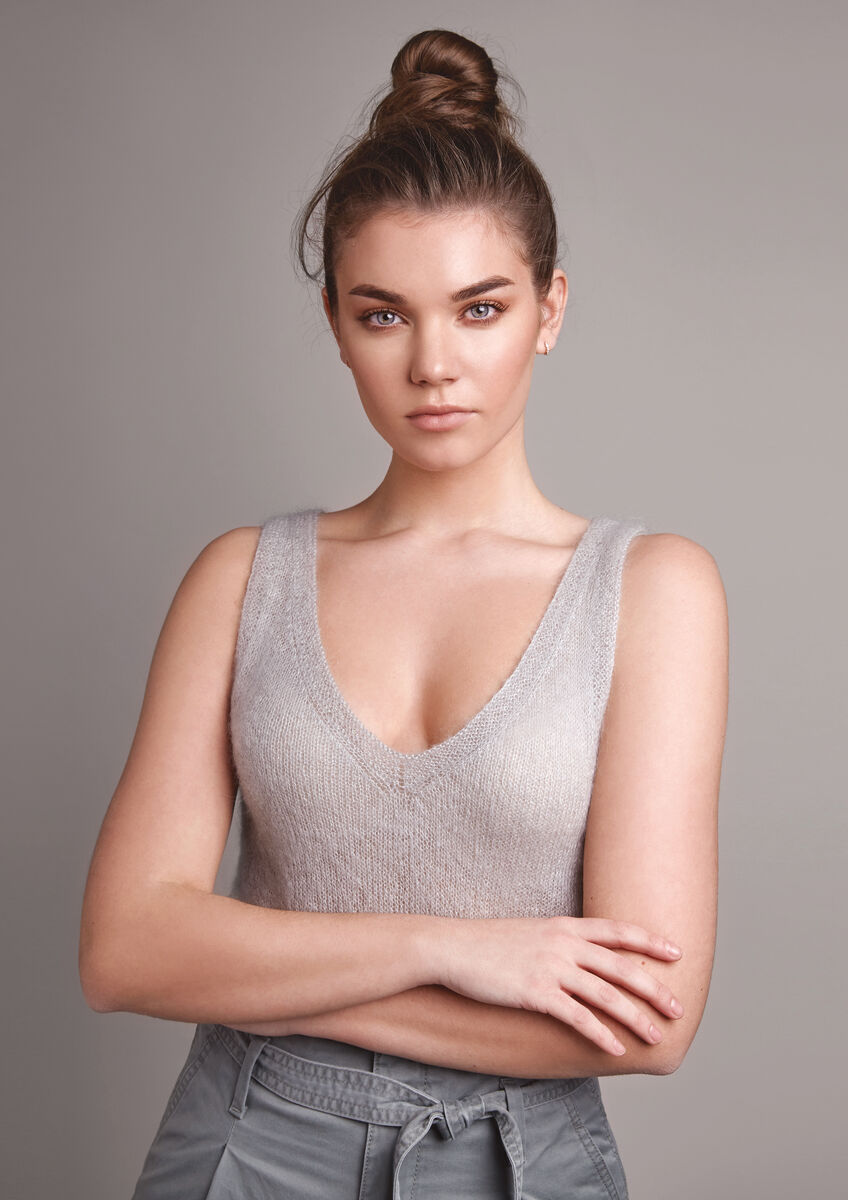 This vest top was designed by Kim Hargreaves and is knitted in our luxurious Kidsilk Haze, a lovely blend of 70% mohair and 30% silk. It features a split hem and can be worn with the V-neck shaping at the front or the back, making this a versatile garment.