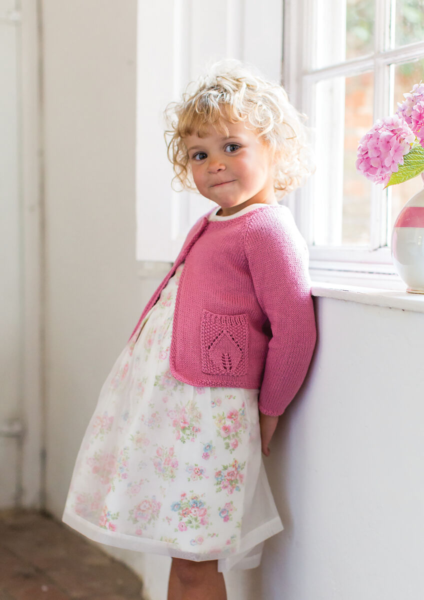 Knit this stunning, cardigan from the Little Rowan Blossom book. The cardigan features a scoop neck with three buttons and two useful front pockets with a textured leaf motif.