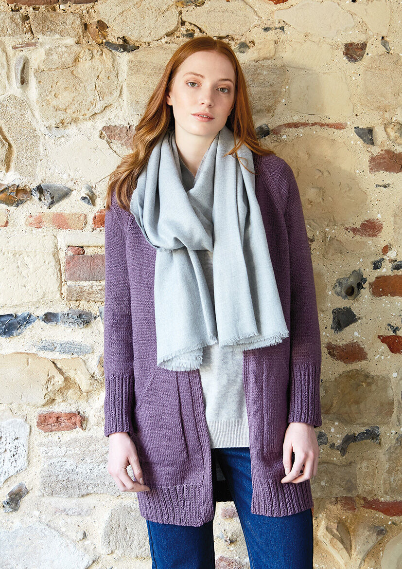 This lovely long cardigan features pockets and raglan sleeves. It is knitted in one shade of Softyak DK, a mix of 76% cotton, 15% yak and 9% nylon. It was designed by Martin Storey.