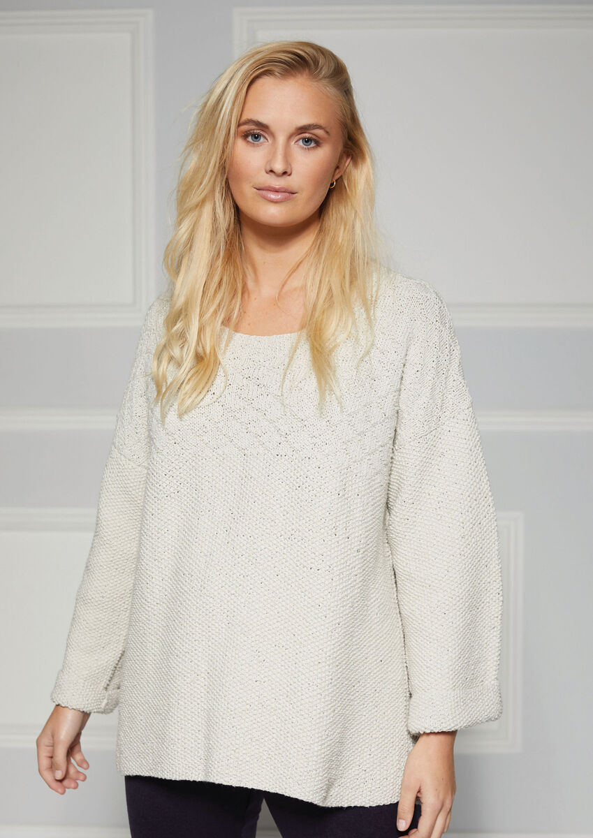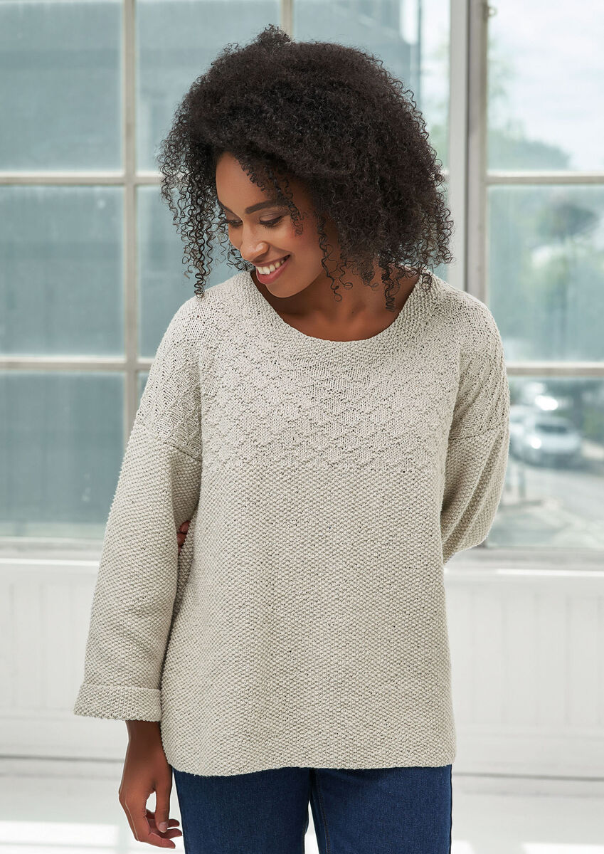 An over-sized drop-shoulder sweater worked in moss and diamond stitch, beautifully highlighted by the crisp Denim Revive yarn.