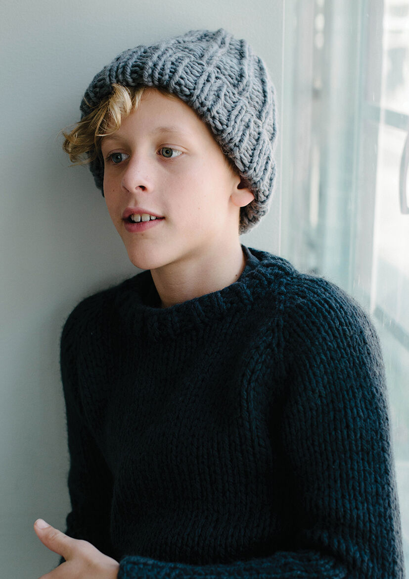 This lovely crew neck sweater for children was designed by Jen Geigley. It is knitted in stocking stitch and uses one shade of Big Wool, a 100% wool yarn.