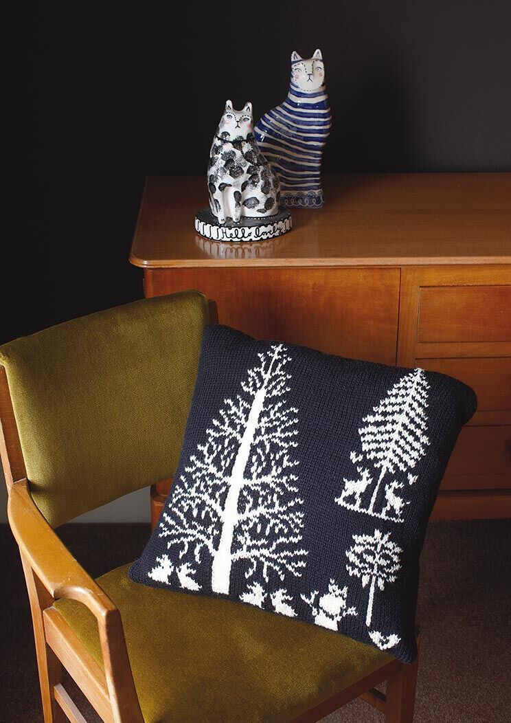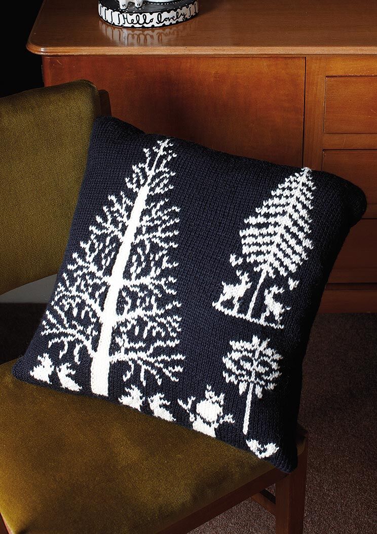 Knit this homeware cushion from Rowan at Home, a design by Martin Storey using our versatile, hard wearing yarn Pure Wool Superwash Worsted (wool.) With a wonderful intarsia pattern of a forest scene, this pattern is suitable for the more experienced knitter.