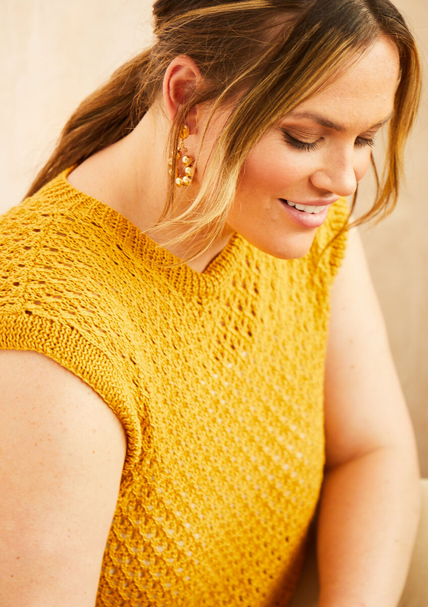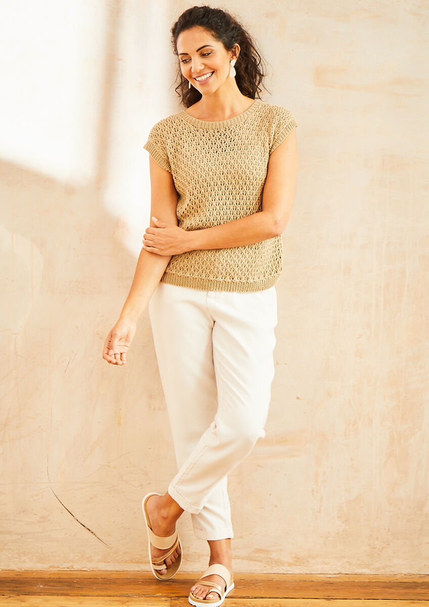 This pretty summer top from Quail Studio is knitted using Summerlite 4ply. 100% pure cotton, this yarn is ideal for summer knits. A charming all-over lace pattern with a flattering split at the centre back, guarantees this useful tee will make a stylish statement this season.