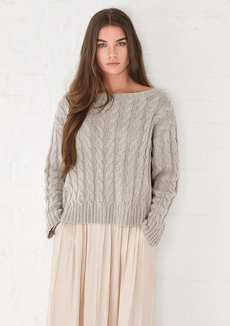 Knit this ladies sweater from Flutter, a design by Kim Hargreaves using our soft, dry handle yarn Creative Linen (cotton and linen.) This cable sweater has the option to knit with either a round or v neckline and the pattern is suitable for the average knitter.