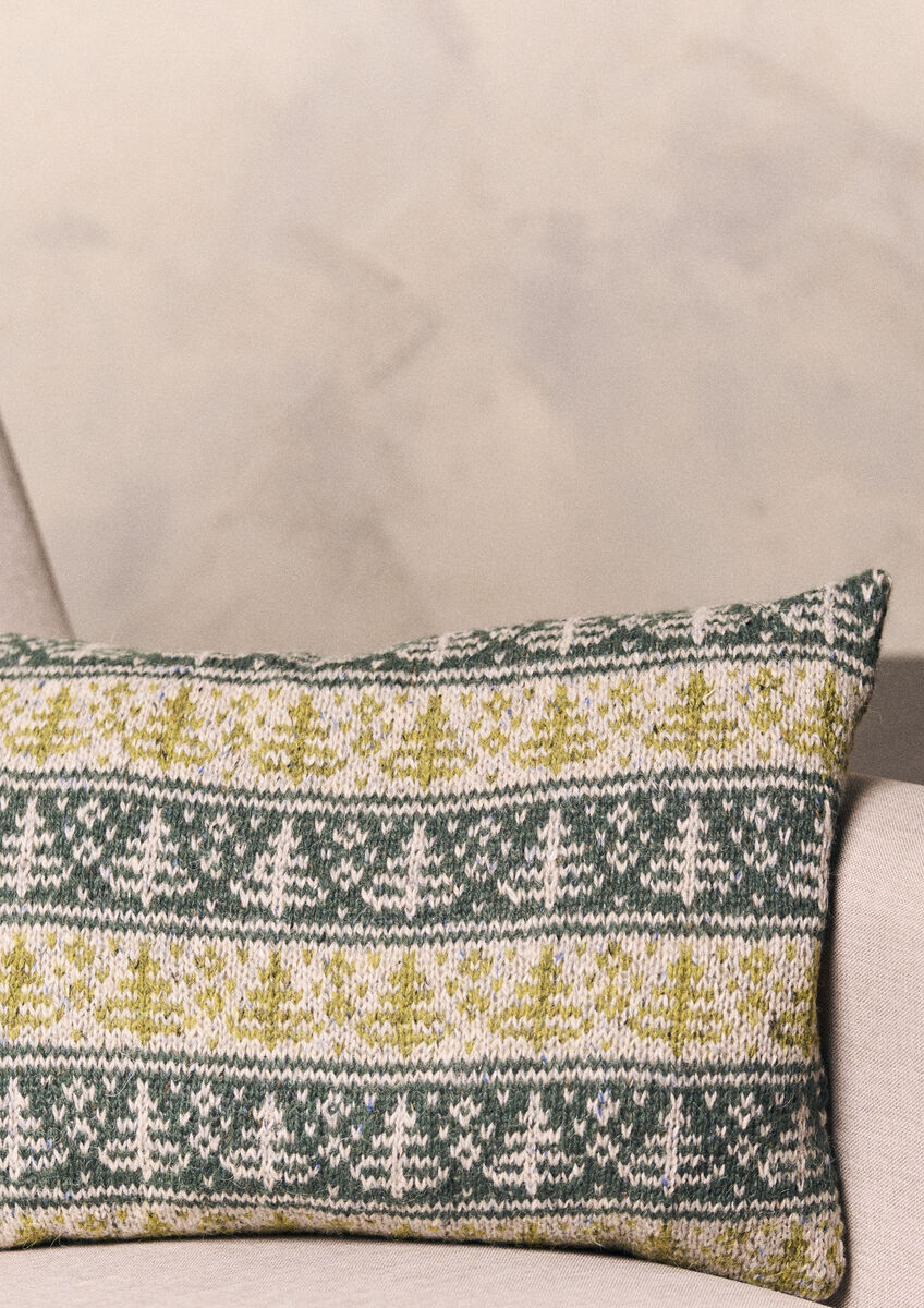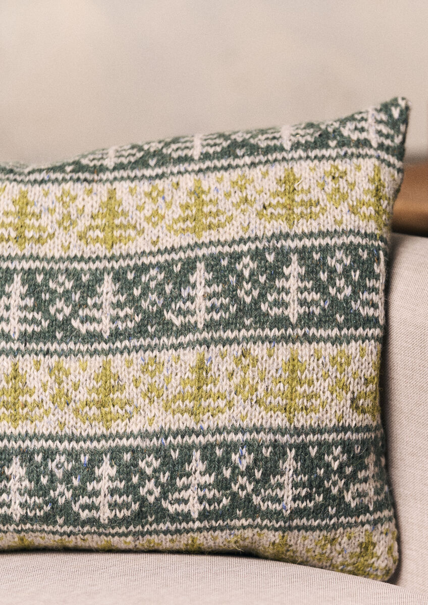 Inspired by the popular hottie and cafetiere of the same name, Martin Storey’s Fir cushion is a charming festive addition to your living space. This Fair Isle knit features bands of fir tree motifs worked in three shades of Felted Tweed.