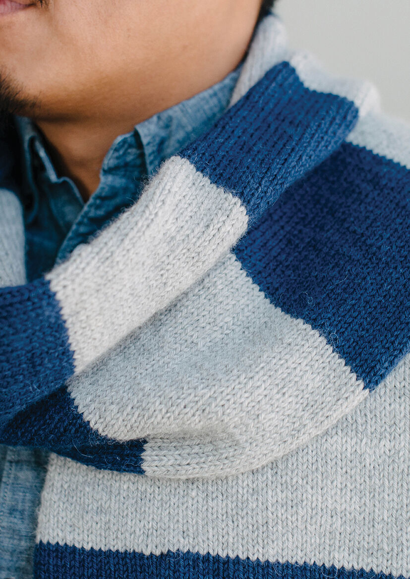 This beautiful striped scarf was designed by Jen Geigley and is a great unisex accessory. It is knitted in two shades of Alpaca Soft DK, a soft blend of 70% virgin wool and 30% alpaca.