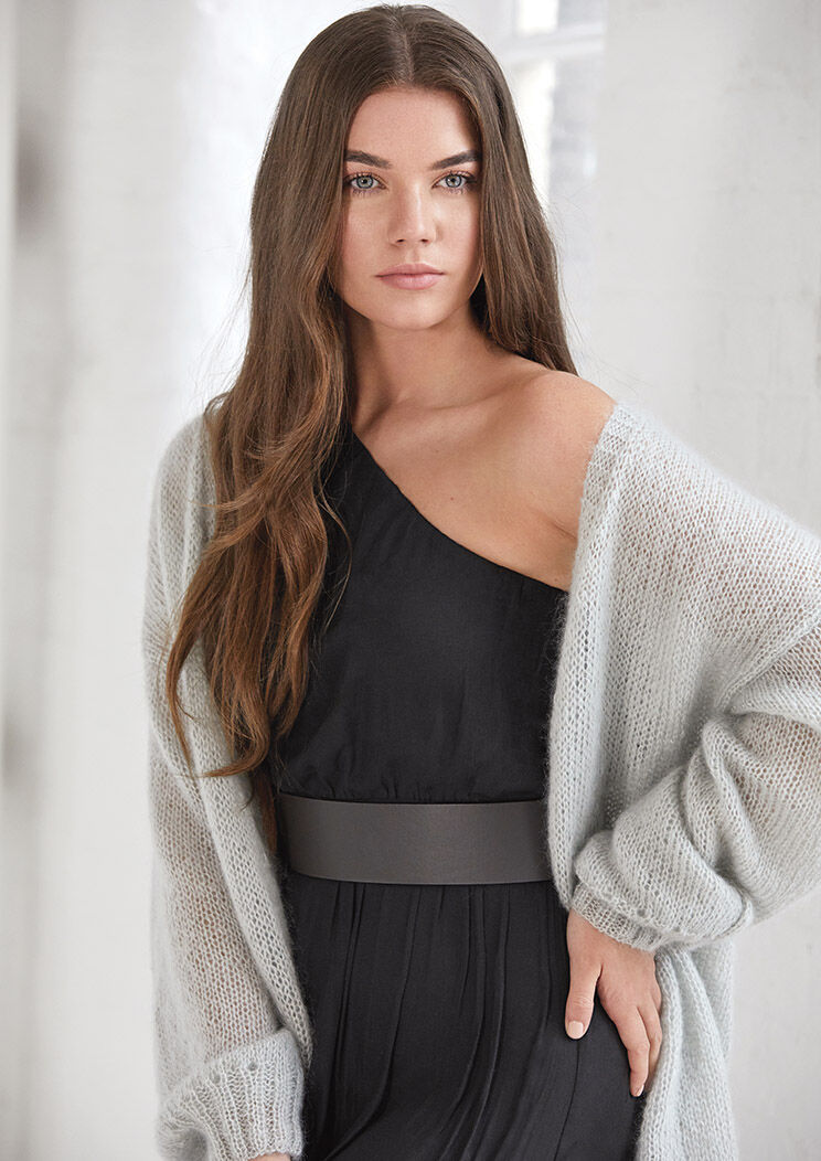 Knit this ladies cardigan from Flutter, a design by Kim Hargreaves using our ever popular yarn Kidsilk Haze (mohair and silk.) This longline cardigan is a wardrobe essential and the pattern is suitable for the average knitter.
