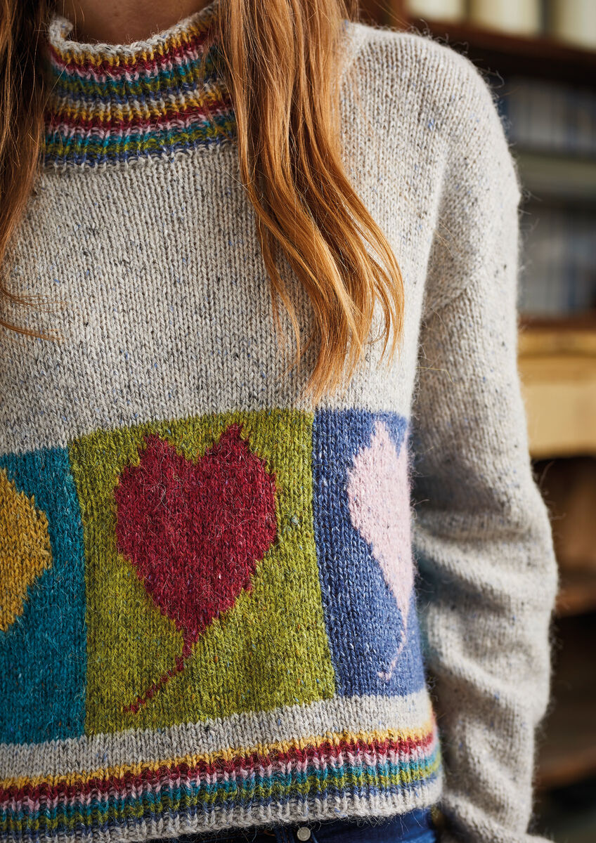 Knit this colourful jumper from Dee Hardwicke's Colourwork Knits book. The cropped jumper features a roll neck with three contrasting heart motif squares and colourful ribbed edges.
