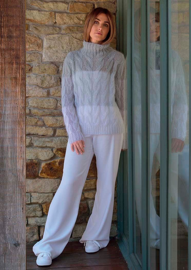 Knit this ladies sweater, a design by Kim Hargreaves using our ever popular yarn Kidsilk Haze ( mohair and silk.) With a chunky cable pattern, delicate shades have been chosen so that the stripe sequence has a subtle effect.