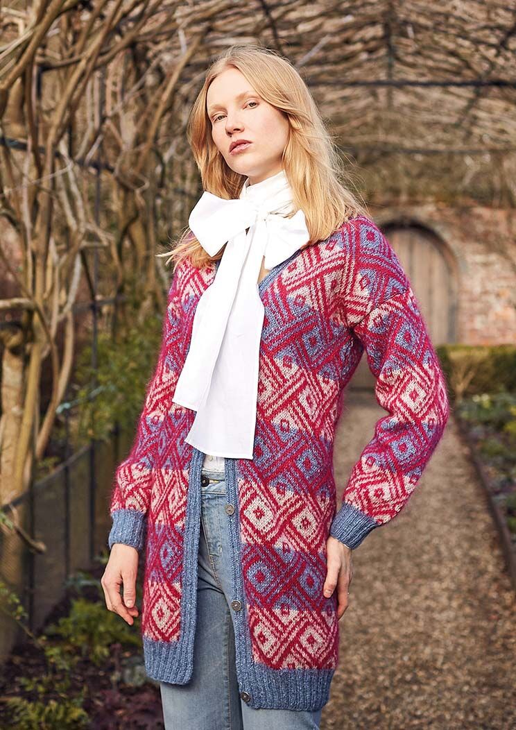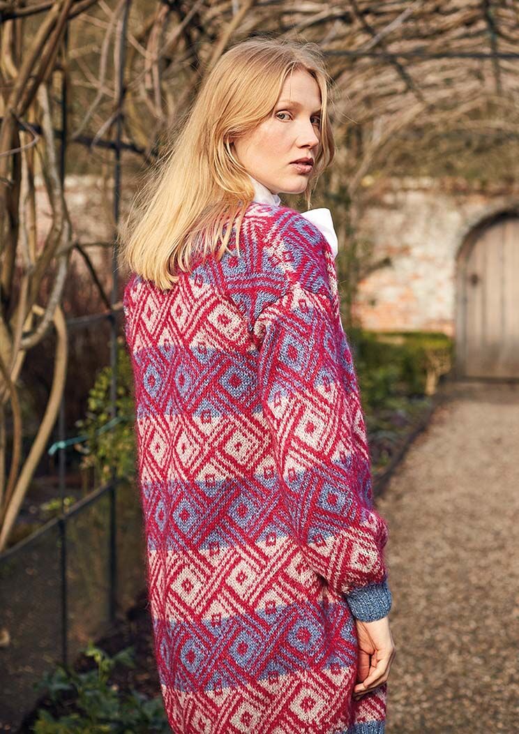 Knit this women's longline jacket from New Nordic, a design by ARNE & CARLOS using the stunning combination of Felted Tweed (wool, alpaca and viscose) and Kidsilk Haze (mohair and silk.) With an all over Nordic inspired Fairisle pattern knitted in contrasting stripes, this pattern is suitable for more experienced knitter.
