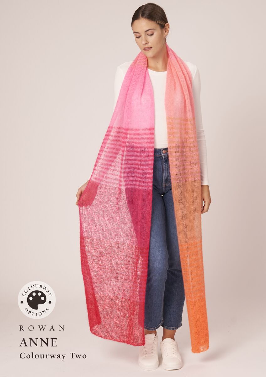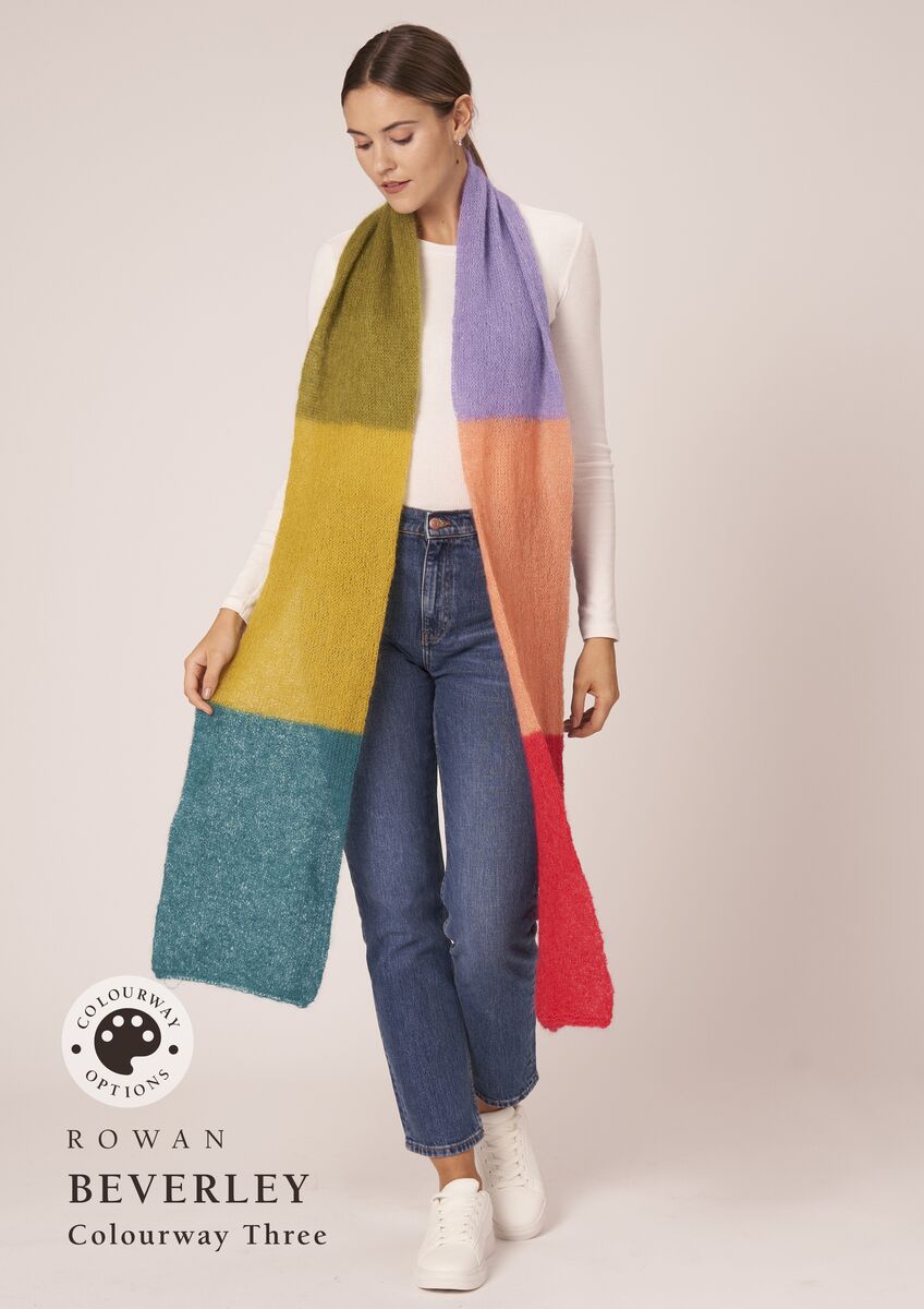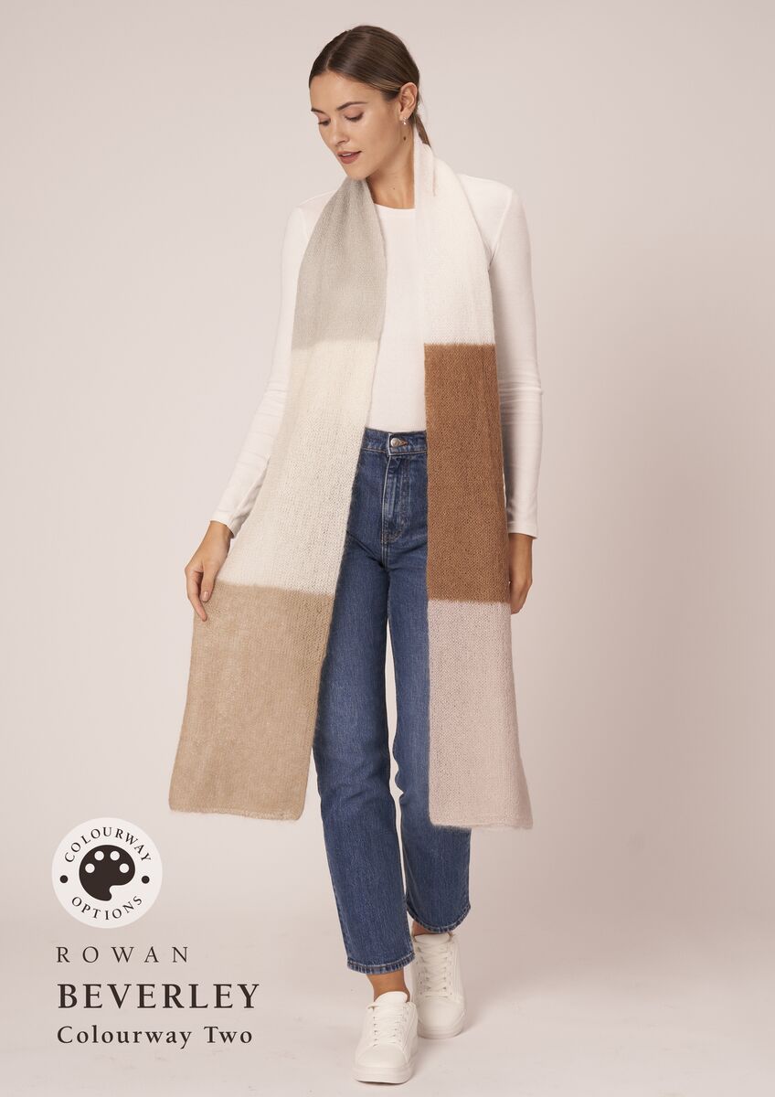 Anne is an enchanting wrap worked in blocks of colour with subtle stripes to taking you effortlessly from one shade to the next, whilst Beverley is a bold colour block scarf knitted in the round to create a wonderful double-sided fabric. Both designs are knitted using six shades.