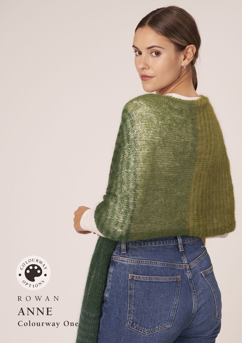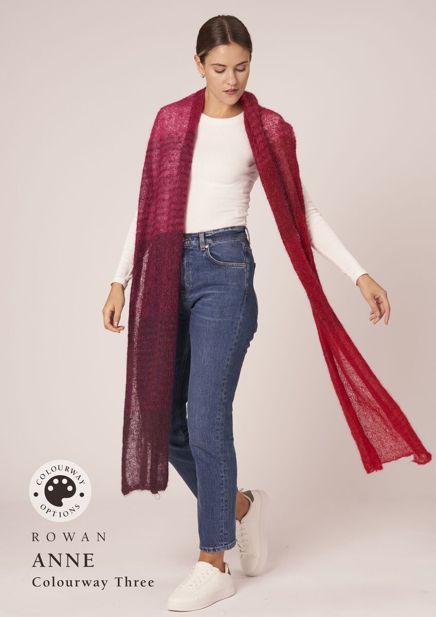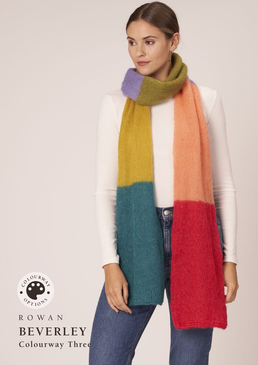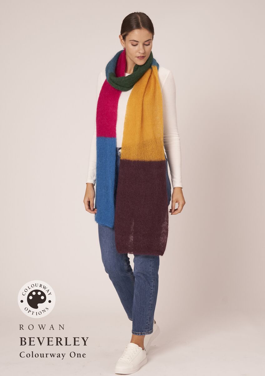 Anne is an enchanting wrap worked in blocks of colour with subtle stripes to taking you effortlessly from one shade to the next, whilst Beverley is a bold colour block scarf knitted in the round to create a wonderful double-sided fabric. Both designs are knitted using six shades.