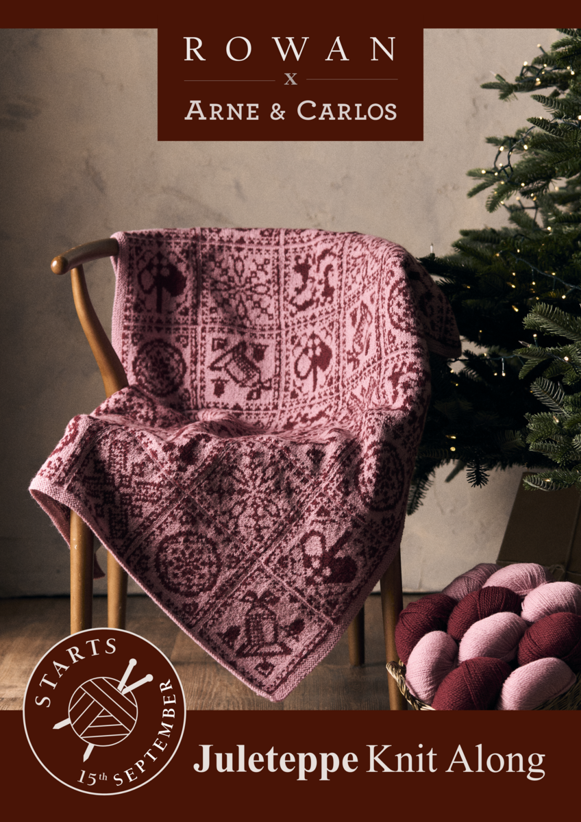 Juleteppe is knitted using Rowan Norwegian Wool and Kristen Colourway featuring a soft pink and rich burgundy is a modern take on the more traditional red and white palette.
