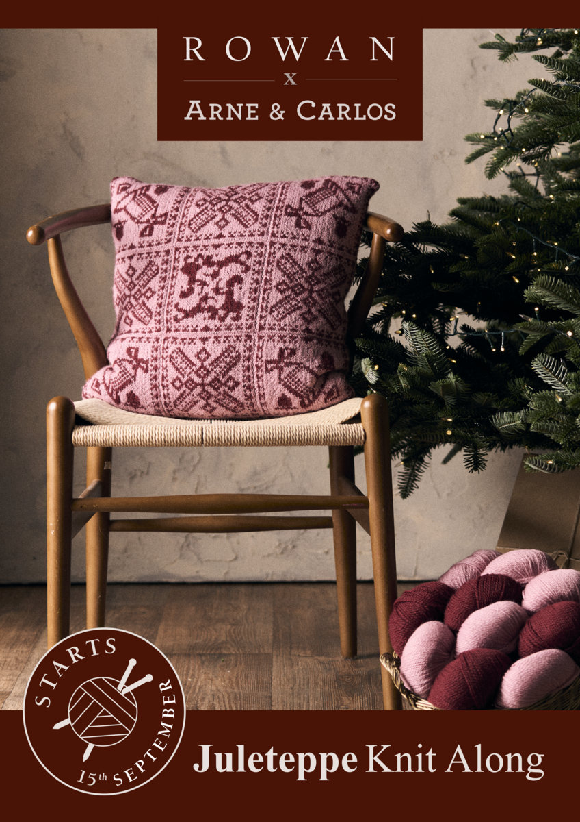 Juleteppe is knitted using Rowan Norwegian Wool and Kristen Colourway featuring a soft pink and rich burgundy is a modern take on the more traditional palette of red and white.