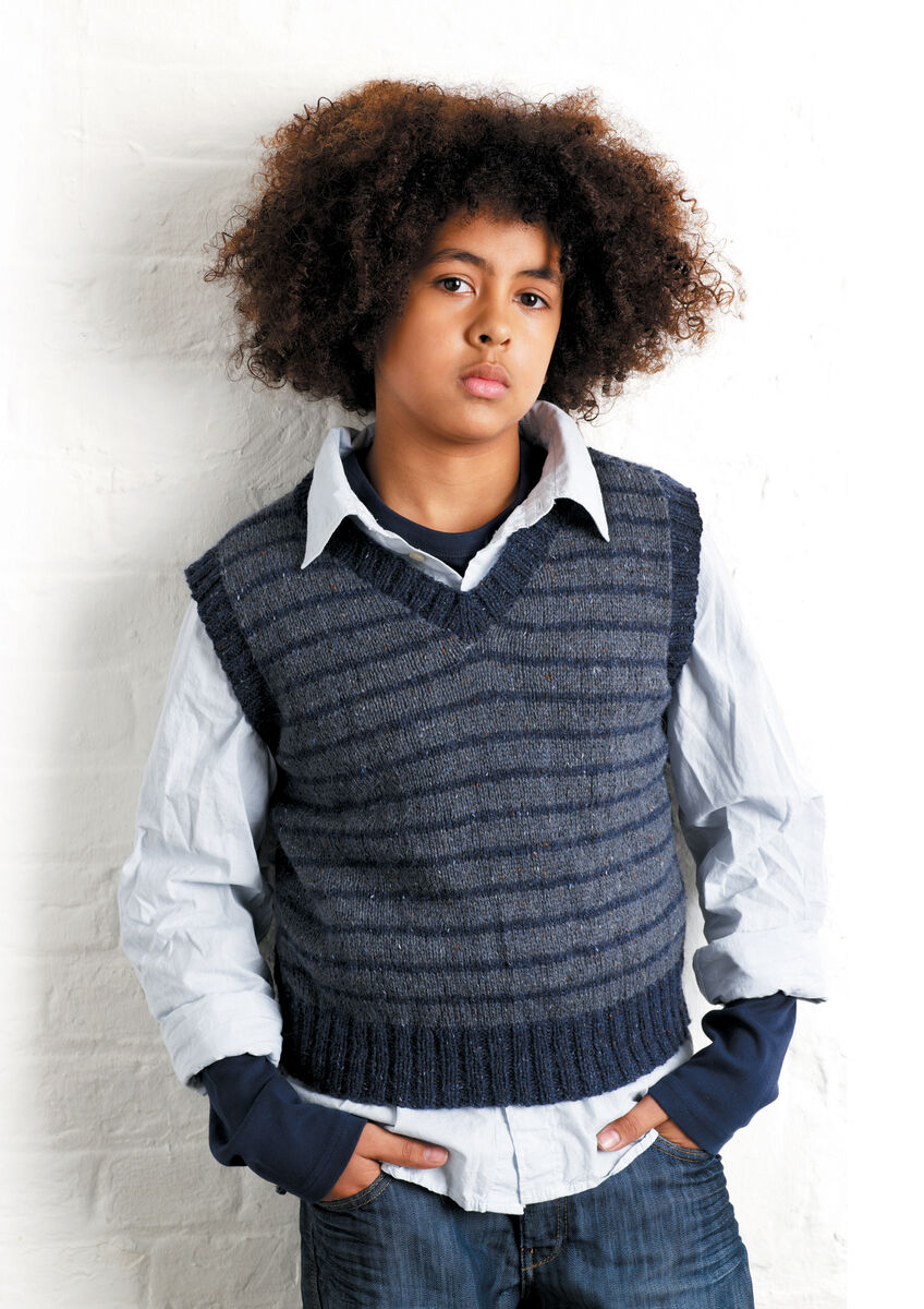 This cool tank top for boys was designed by Sarah Hatton using Felted Tweed, a lovely blend of 50% merino wool, 25% aplaca and 25% viscose with a rustic effect. Featuring stylish horizontal stripes, this is a perfect option for a smart-casual look.
