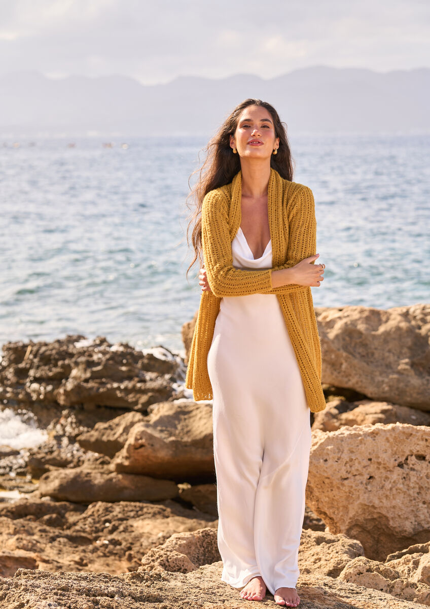 A long, shawl-neck cardigan works well in the summer months. This versatile layering knit in airy Alpaca Cotton offers comfort and style in equal measure. The delicate lace stitch keeps things lightweight and cool, whilst also adding a touch of elegance. Perfect for layering over a sundress or pairing with shorts and a vest, this cardigan will provide just the right amount of coverage for those cooler summer evenings.