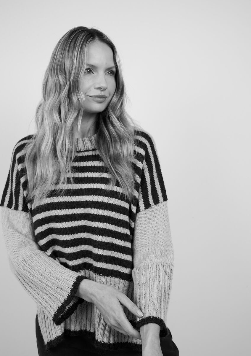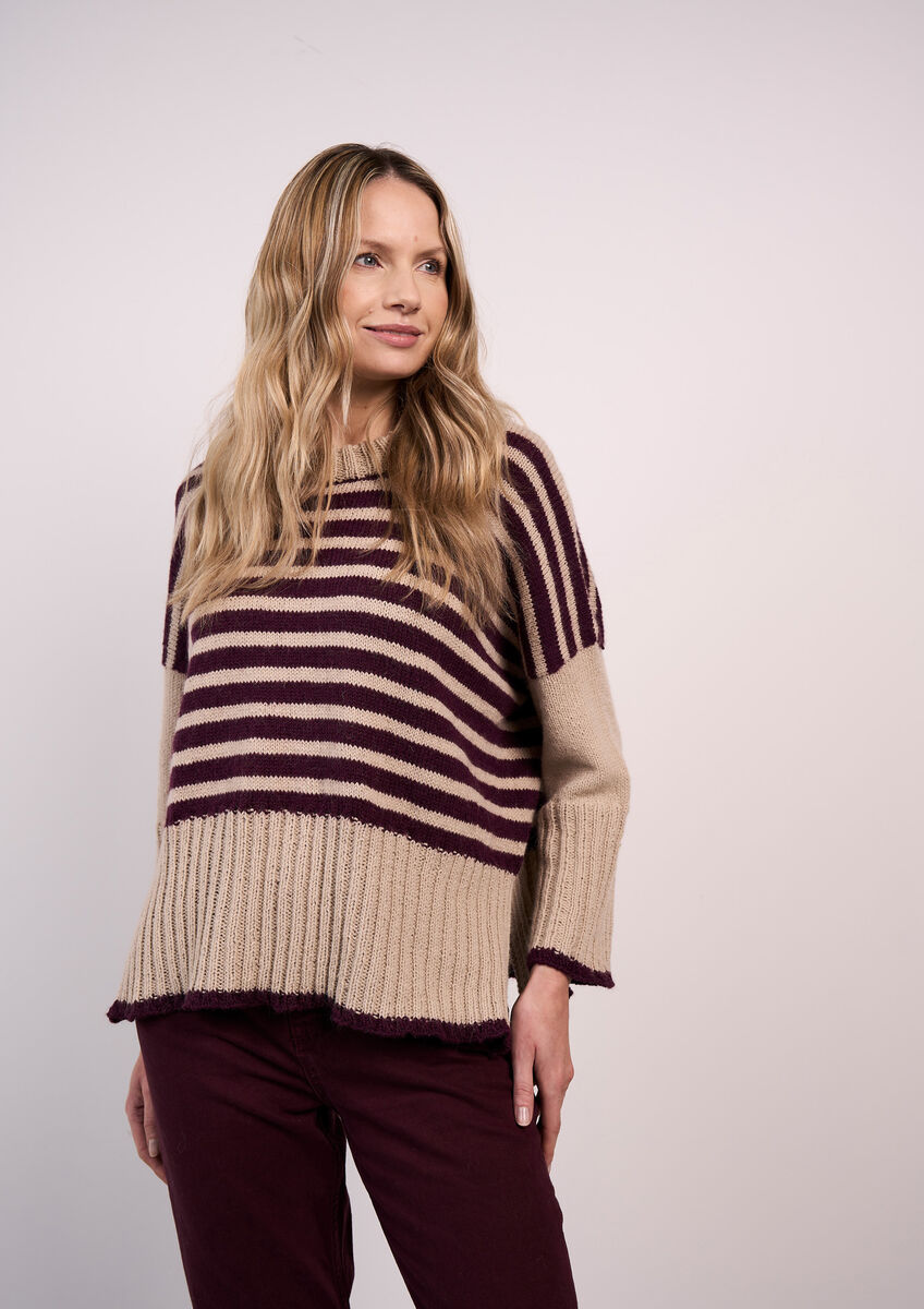 This striped jumper is worked topped down and has an oversized, boxy fit. Featuring stocking stitch sleeves with ribbed hems and cuffs and contrasting detailing on the edges. This is an Autumn Winter wardrobe staple.