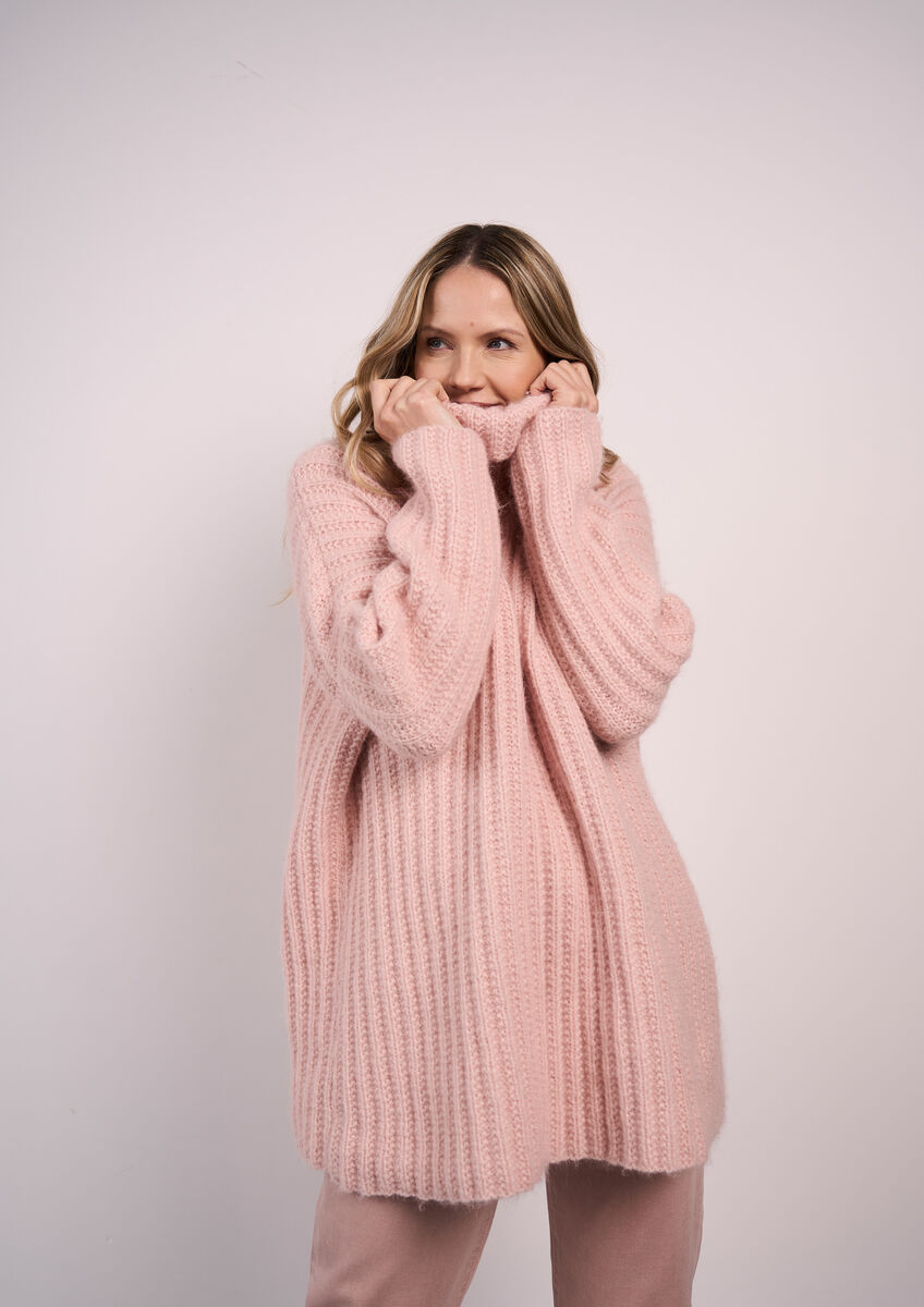Marlowe is an elegant, super cosy sweater knit in all over mistake rib stitch with a roll neck and oversize fit. Knit with Softest Alpaca yarn it has a luxurious warmth for those cold days.