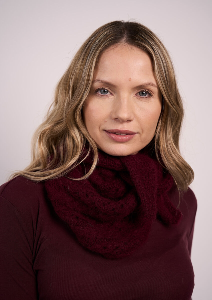 Bryony is a beanie style hat knit in the round with cable and lace detailing and a ribbed hem. A striking tapered scarf that ties magnificently giving a chic, cosy feel completes this set. These pieces are designed by Katherina von Blumenthal and showcase her use of subtle detailing to add interest.