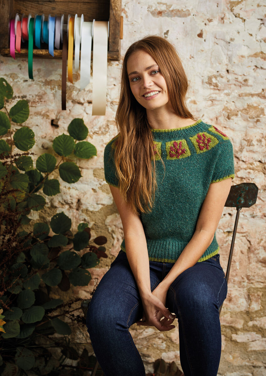 Knit this stunning top from Dee Hardwicke's Colourwork Knits book. The short-sleeved top is worked in three shades and features and an Oak Leaf yoke with ribbed hems.