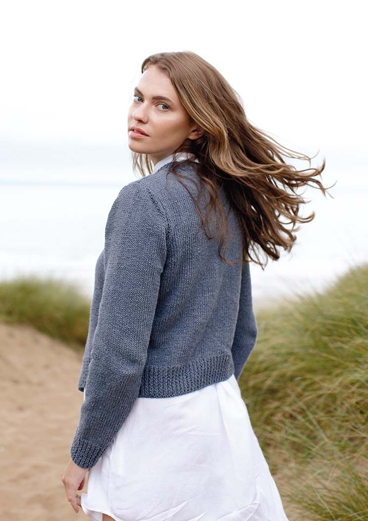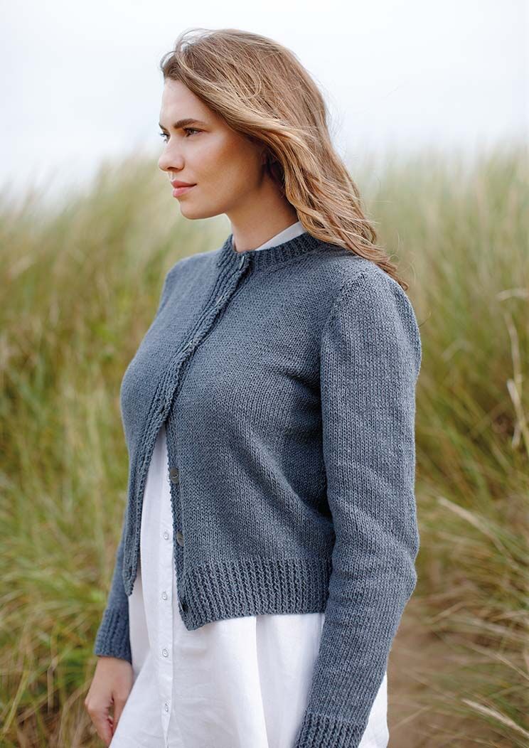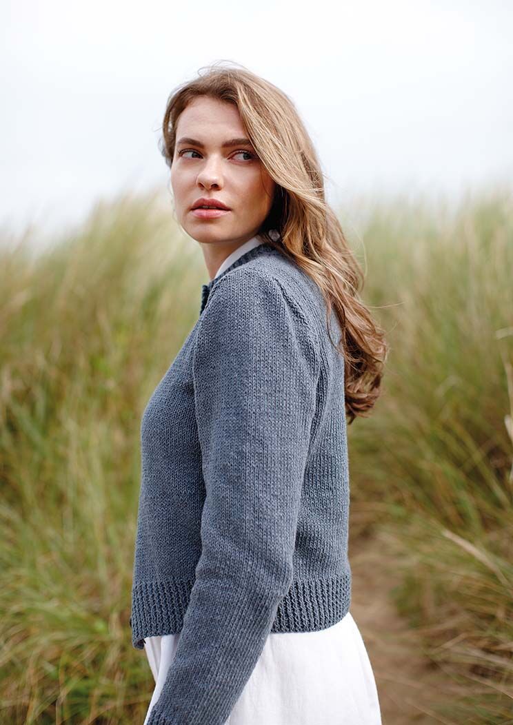 Knit this round neck cardigan , a design by Martin Storey using our versatile yarn originally sourced from recycled denim, Denim Revive (cotton and other fibers.) This shorter length cardigan has ribbed edgings and the pattern is suitable for the average knitter.