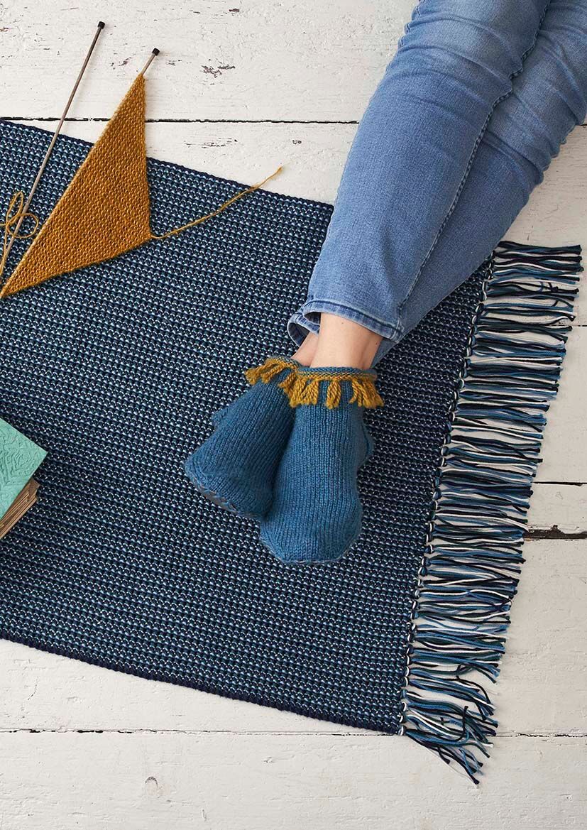 The lovely texture of this rug is created by a simple slip stitch pattern, making it great for a new knitter or anyone looking for a nice meditative projects. When finished, the tail-ends from changing colours are knotted to create a tassel fringing.