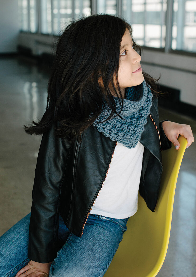 This textured cowl was designed by Jen Geigley and features a bobble pattern. It is available for children and adults and is knitted in one shade of Big Wool, a 100% wool yarn.