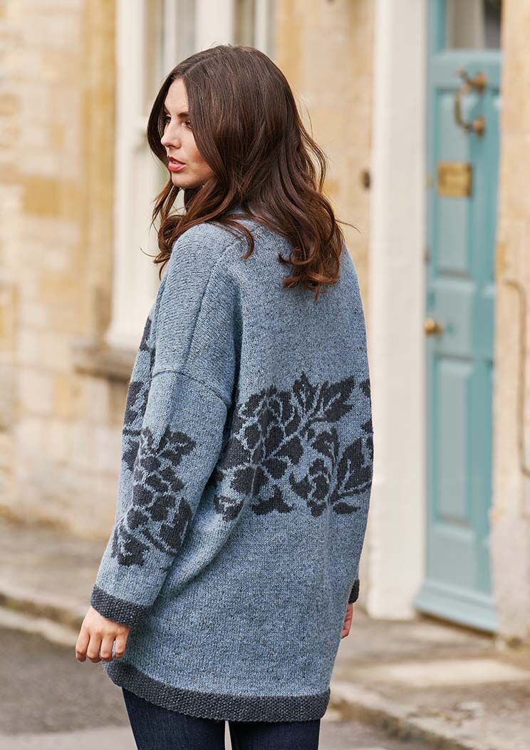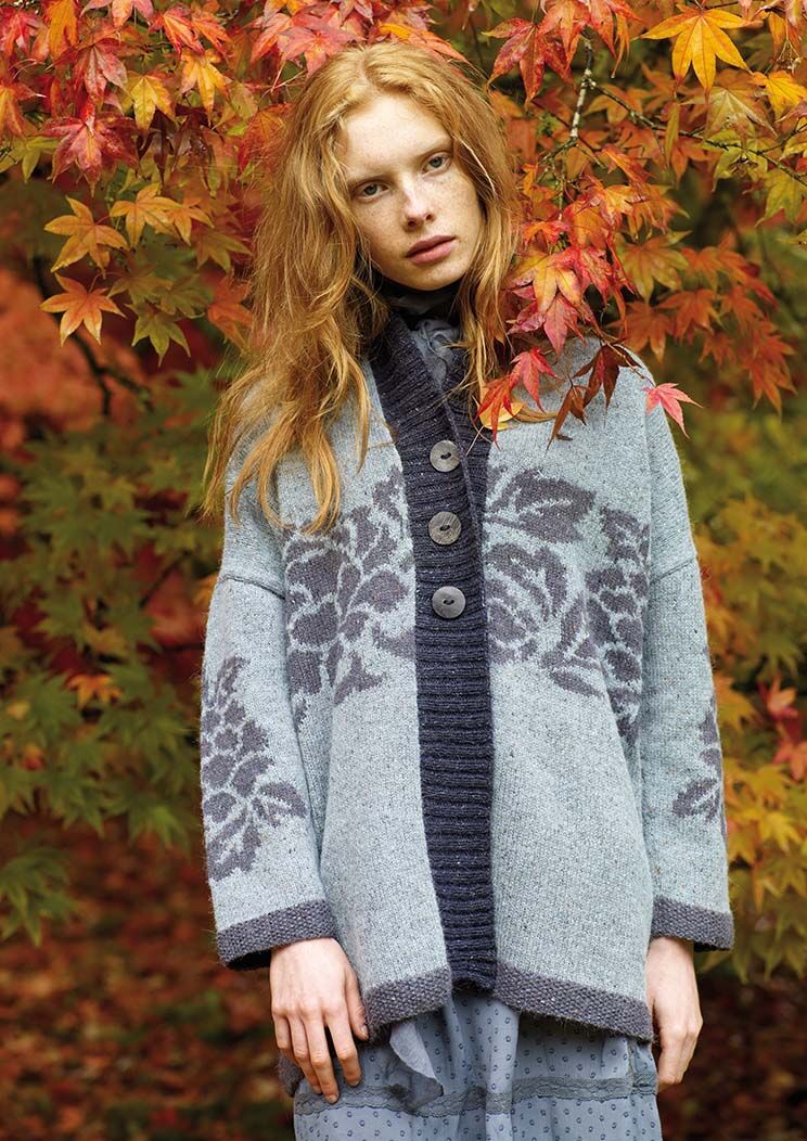 Knit this ladies swing coat, a design by Marie Wallin that has been re-styled and re-photographed for Rowan 40 Iconic Hand-Knit Designs. With stunning intarsia flower motifs and contrasting shawl collar and edgings, this pattern is suitable for the more experienced knitter.