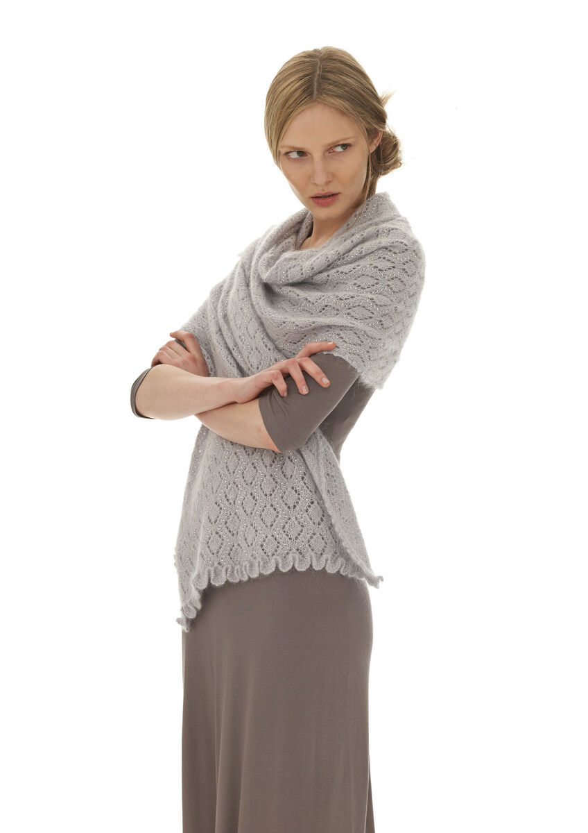 Knit this gorgeous beaded lace wrap designed by Sarah Hazell and using the beautiful yarns Fine Lace and Kidsilk Haze, to create an elegant must have wrap.