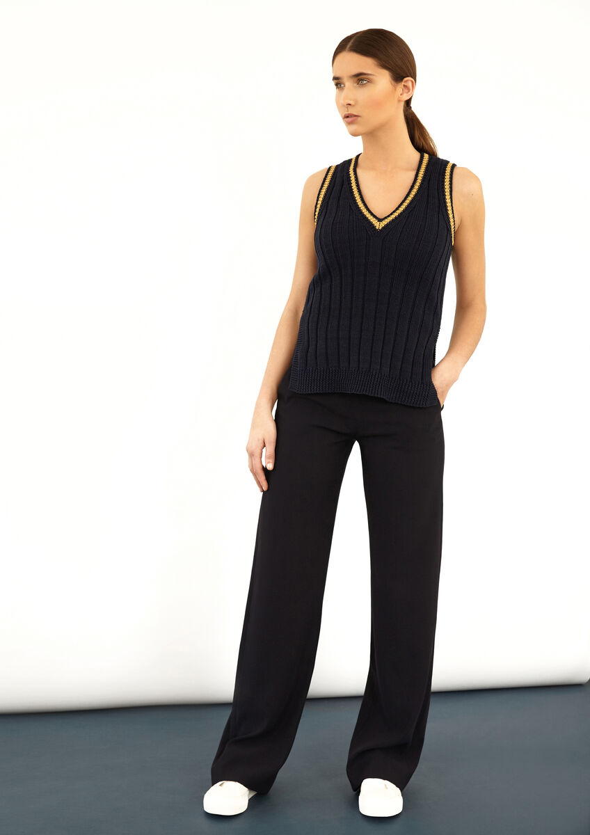 Knitted in Cotton Glace one of our popular 100% cotton yarns this vest top features a ribbed stitch pattern, V-neck and trims in contrast colours. It was designed by Kim Hargreaves and is a versatile summer garment.