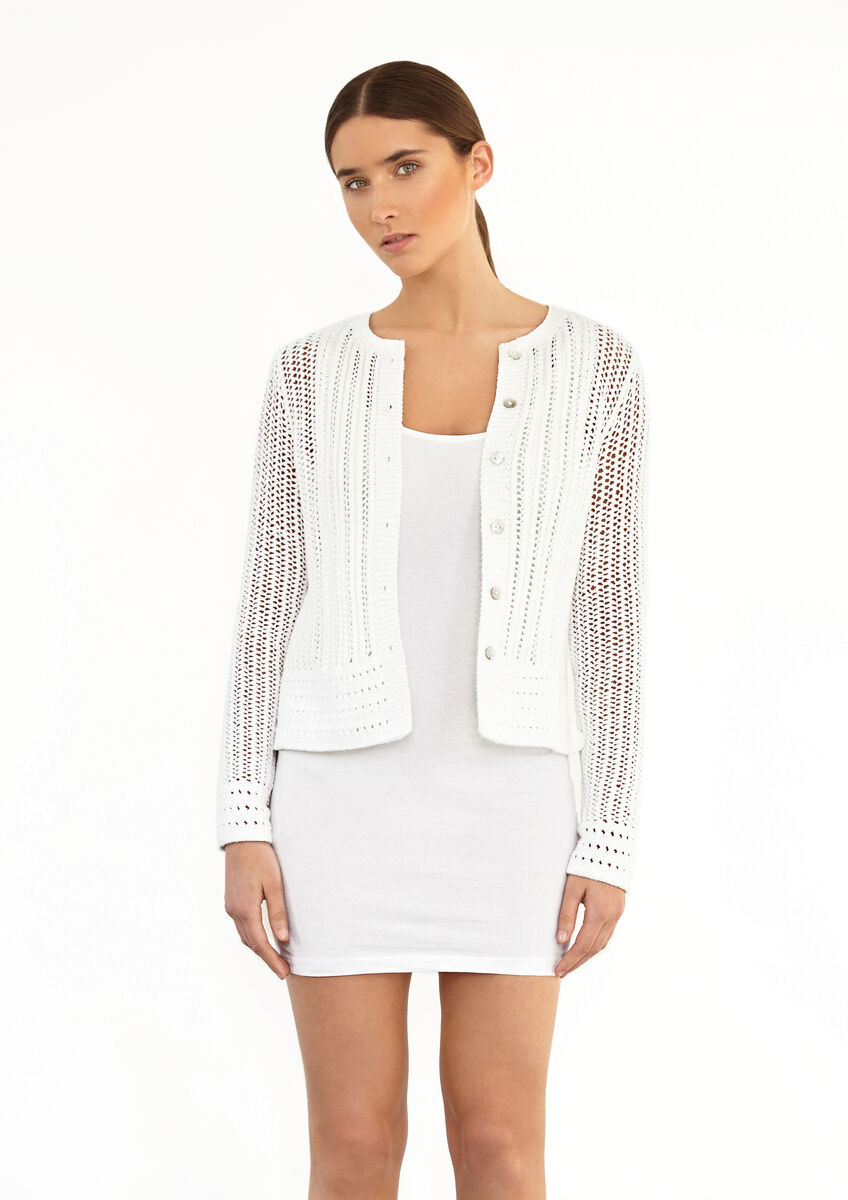 Designed by Kim Hargreaves and using our very popular 100% cotton summer yarn Handknit Cotton this cardigan is worked in faggoting and braids which makes this an interesting project. It has a boxy fit and is suitable for knitters with a little experience.