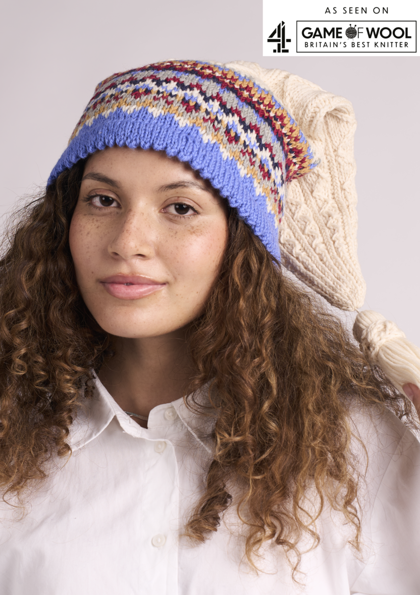 This fun hat by Holger is the perfect blend of traditional techniques and cosy charm. The colourful Fair Isle pattern balances beautifully with the texture of classic cables. Finished with a playful tassel on top, this hat successfully combines heritage craftsmanship and modern style. Knitted using six shades of Rowan’s award-winning Pure Wool Superwash Worsted yarn.