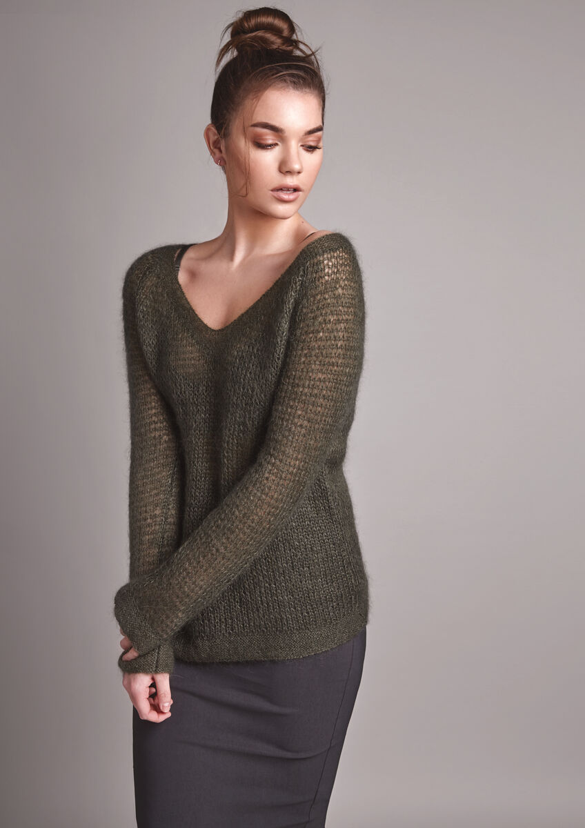 This airy jumper is knitted in Kidsilk Haze, a soft blend of 70% mohair and 30% silk. It was designed by Kim Hargreaves and features raglan sleeves. The airy pattern is created by using two different sizes of needles making this an interesting knitting project.