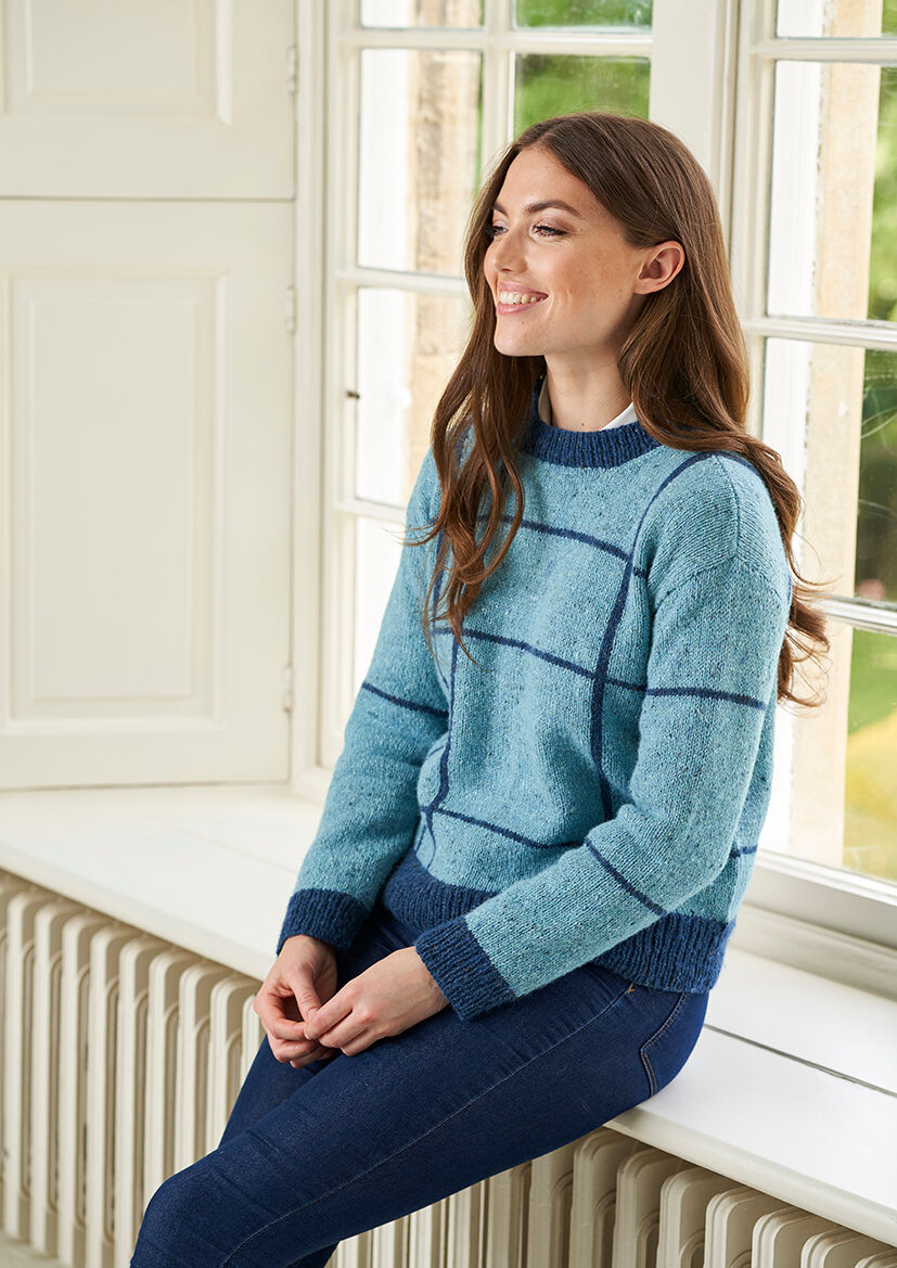 Knit this ladies sweater from Seasonal Palettes by Dee Hardwicke, using one of our best loved yarns Felted Tweed (wool, alpaca and viscose). This slash neck sweater has a contrasting stripe pattern and delicate trailing vine motif along the yoke and bottom of the sleeves.