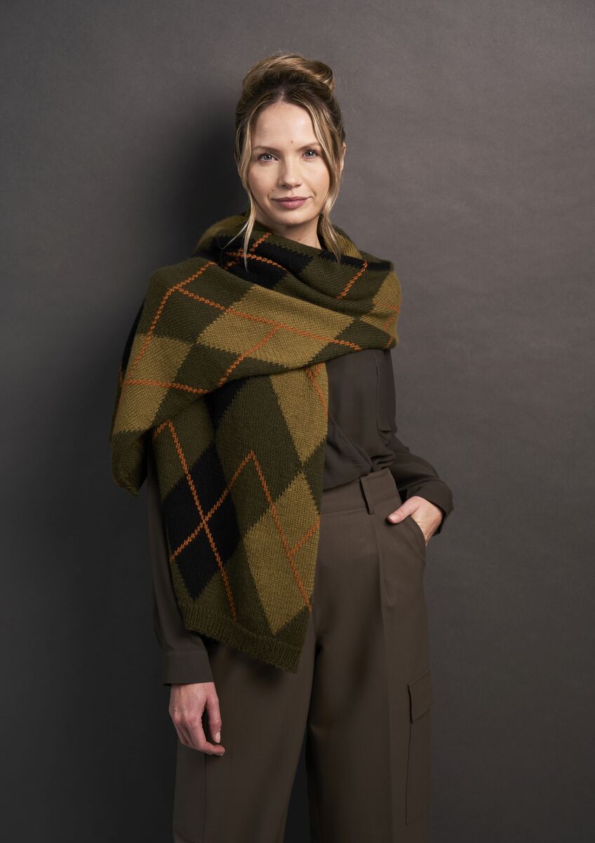 This elegant wrap by Georgia Farrell is knitted using four opulent shades of Rowan Alpaca. Distinct Argyle patterning ensures this autumnal knit delivers both warmth and style.