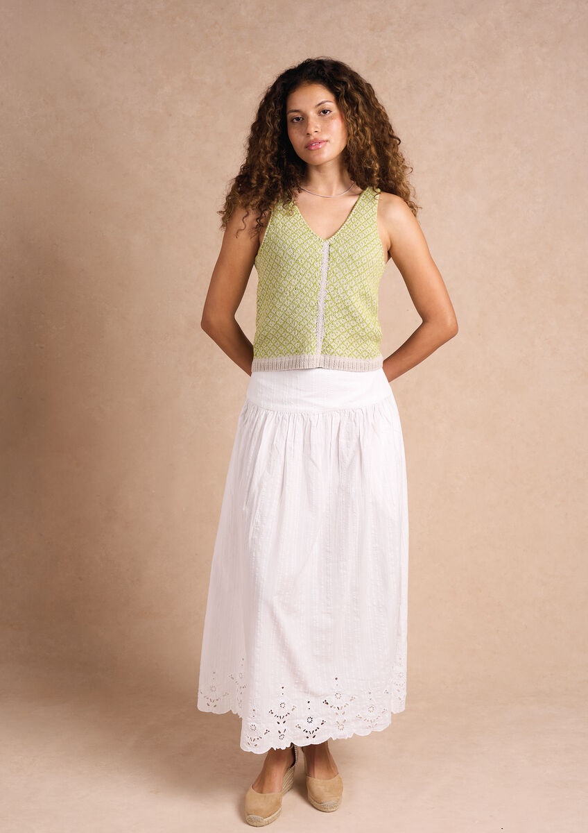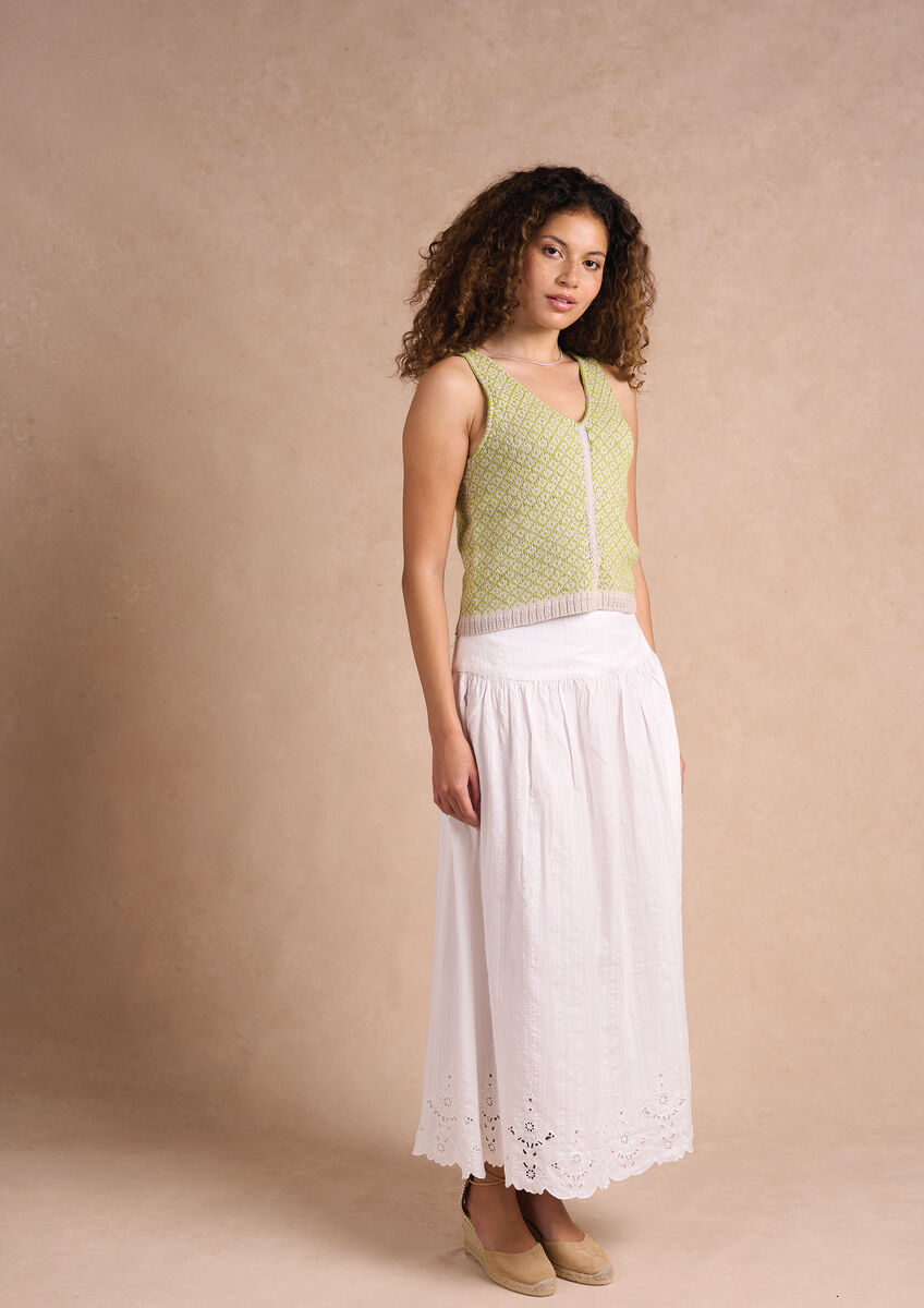 Embrace sunny days in style with this charming vest from Chloe Thurlow. Knit in a simple yet eye-catching Fair Isle pattern, it pairs two fresh shades of Summerlite DK for a light, breezy look. The flattering v-neck and vertical stocking stitch strip down the front add subtle shaping and elegance to this pretty warm-weather knit.