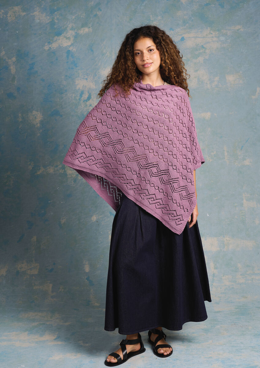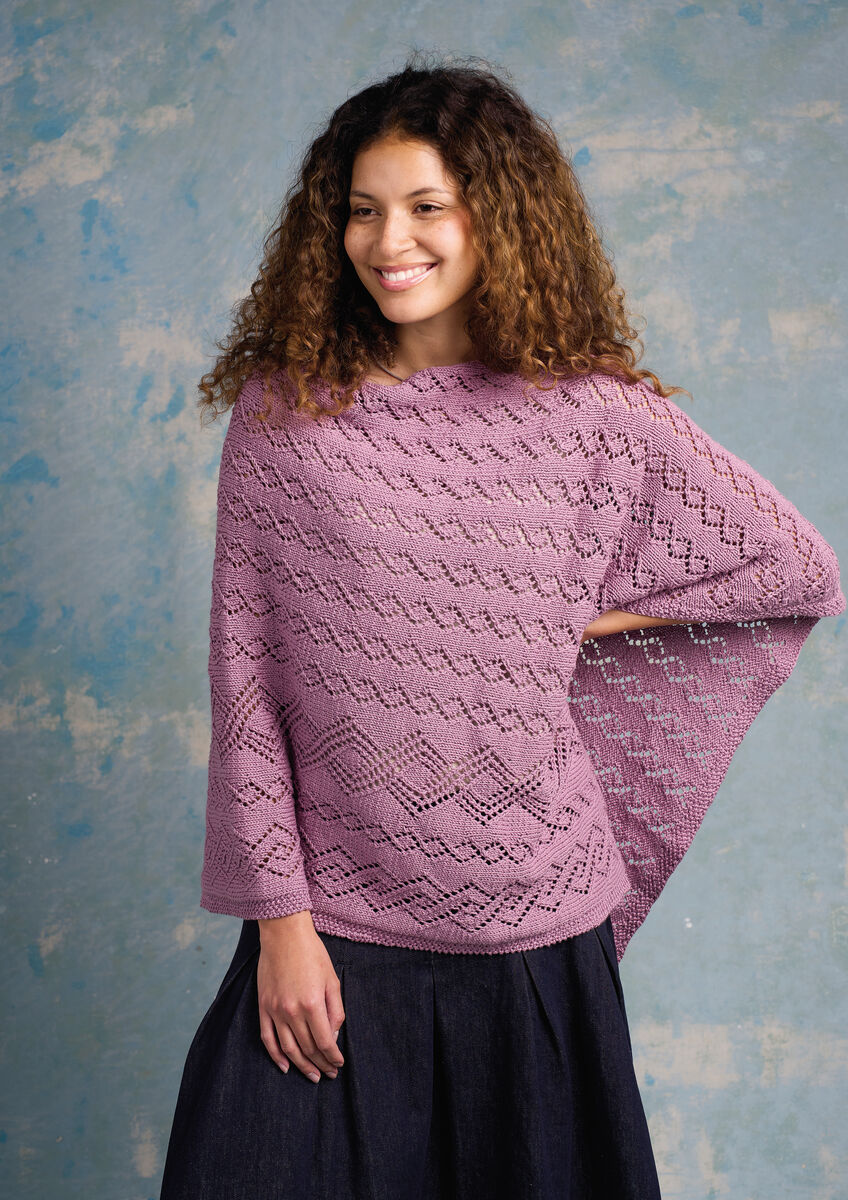 This chic summer poncho from Martin Storey is knitted using a single colour of Summerlite DK. The delicate lace pattern adds a touch of feminine charm and the elegant drape makes it perfect for layering on warm, sunlit days. Knitted in one piece and simply folded in half, it’s as easy to make as it is stylish to wear.