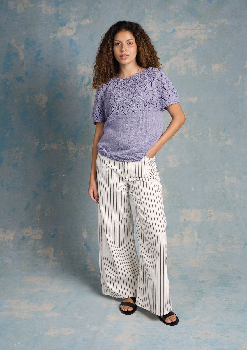 Cast on Martin Storey’s pretty knitted tee for chic summer style. Knitted using Summerlite DK and featuring an elegant lace and cable yoke, this seamless cotton knit is perfect for pairing with your favourite summer outfits, taking you from daytime to evening with ease.