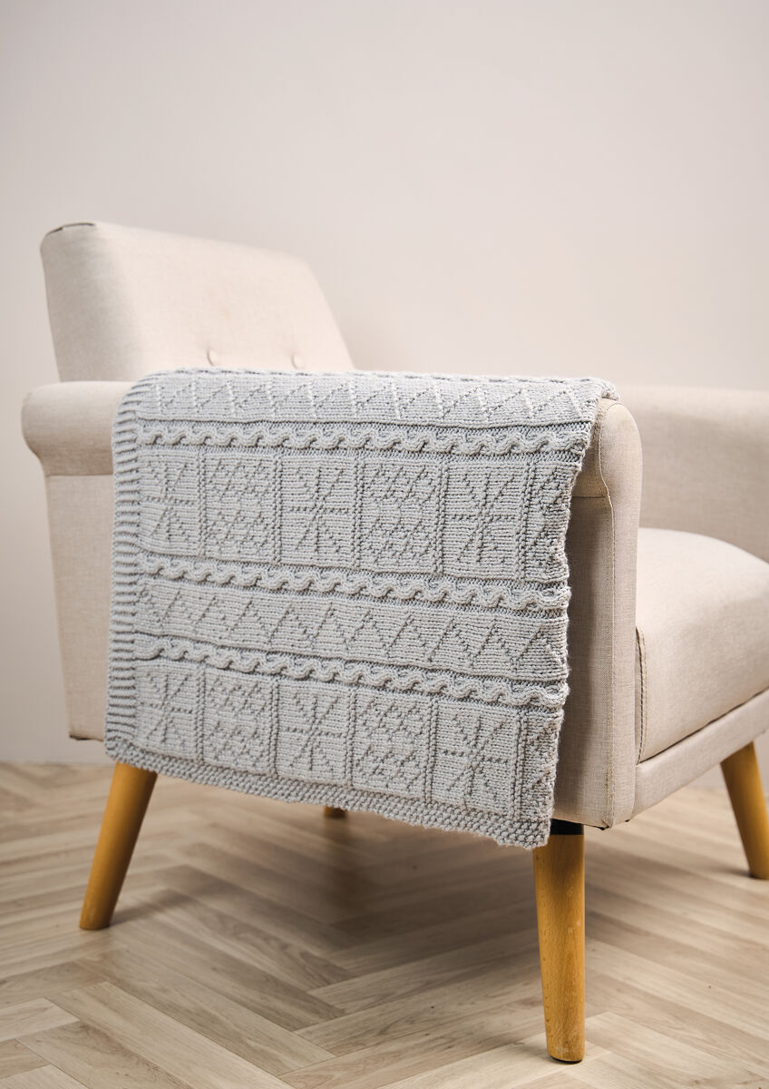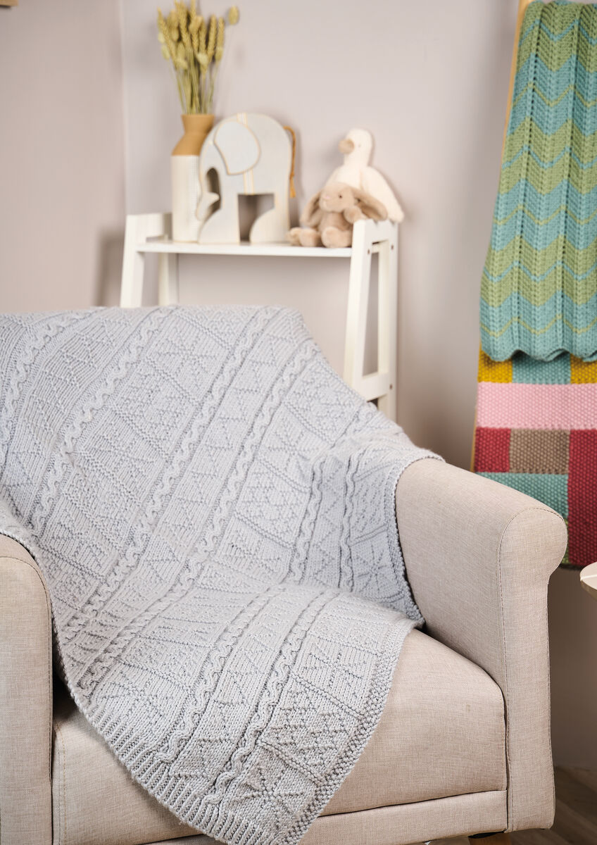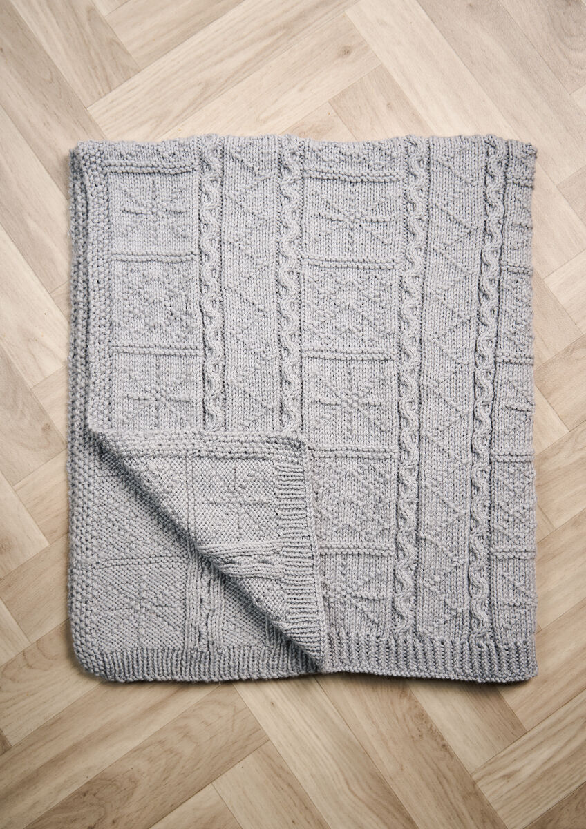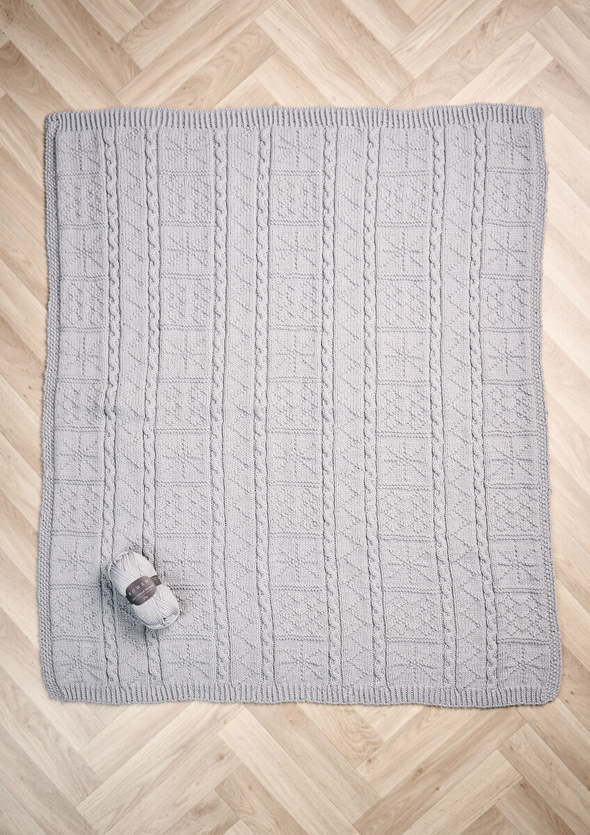 This beautiful baby blanket is knitted in a single, solid colour allowing its detailed texture to really shine. The all-over pattern is a rich tapestry of knit and purl stitches, combining timeless motifs such as cables, stars, chevrons and classic diamonds. Finished with a moss stitch trim and neat ribbed borders, Martin Storey's textured blanket makes a heartfelt, handcrafted gift to be cherished for years to come. Knitted using Baby Cashsoft Worsted.