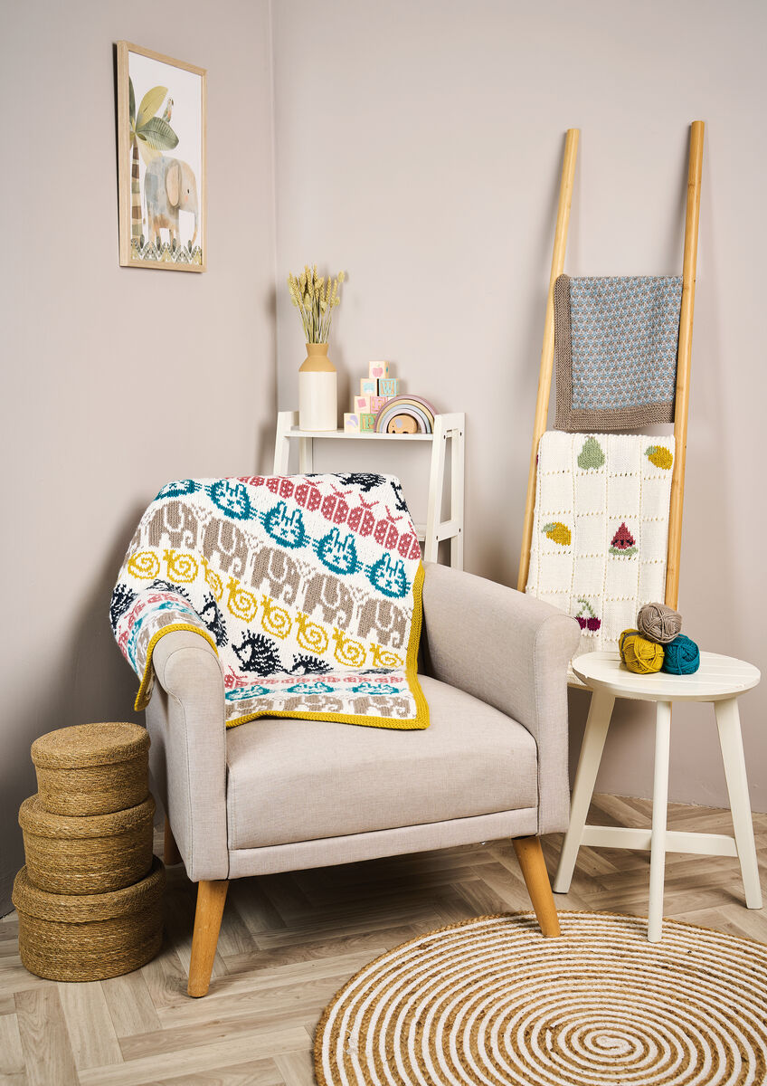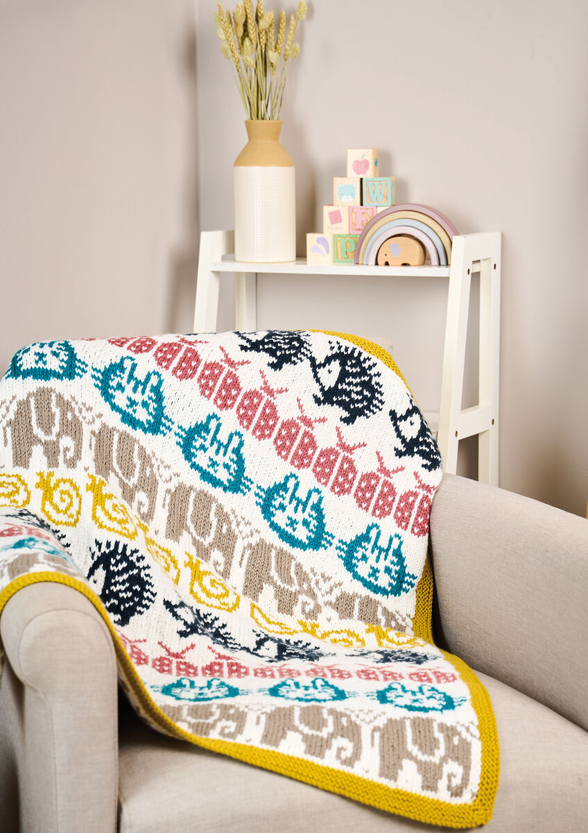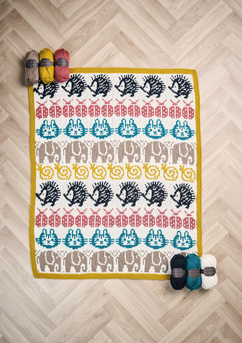 This handknitted baby blanket is a charming mix of colour and whimsy. Knitted using six shades of the sumptuously soft Baby Cashsoft Worsted, this charming Fair Isle design of animal motifs will add a touch of woodland magic to any nursery. Wrap your little one in warmth and wonder with this beautiful Martin Storey design.