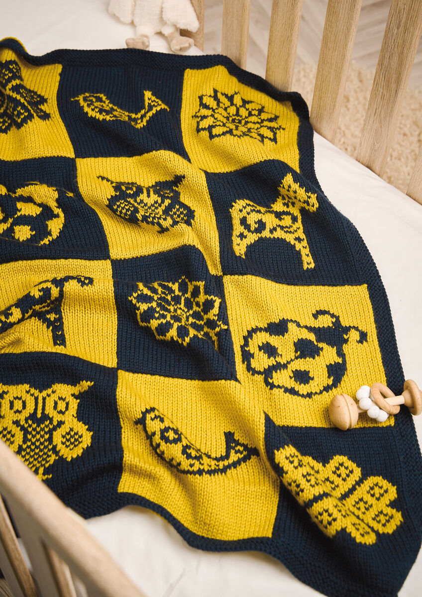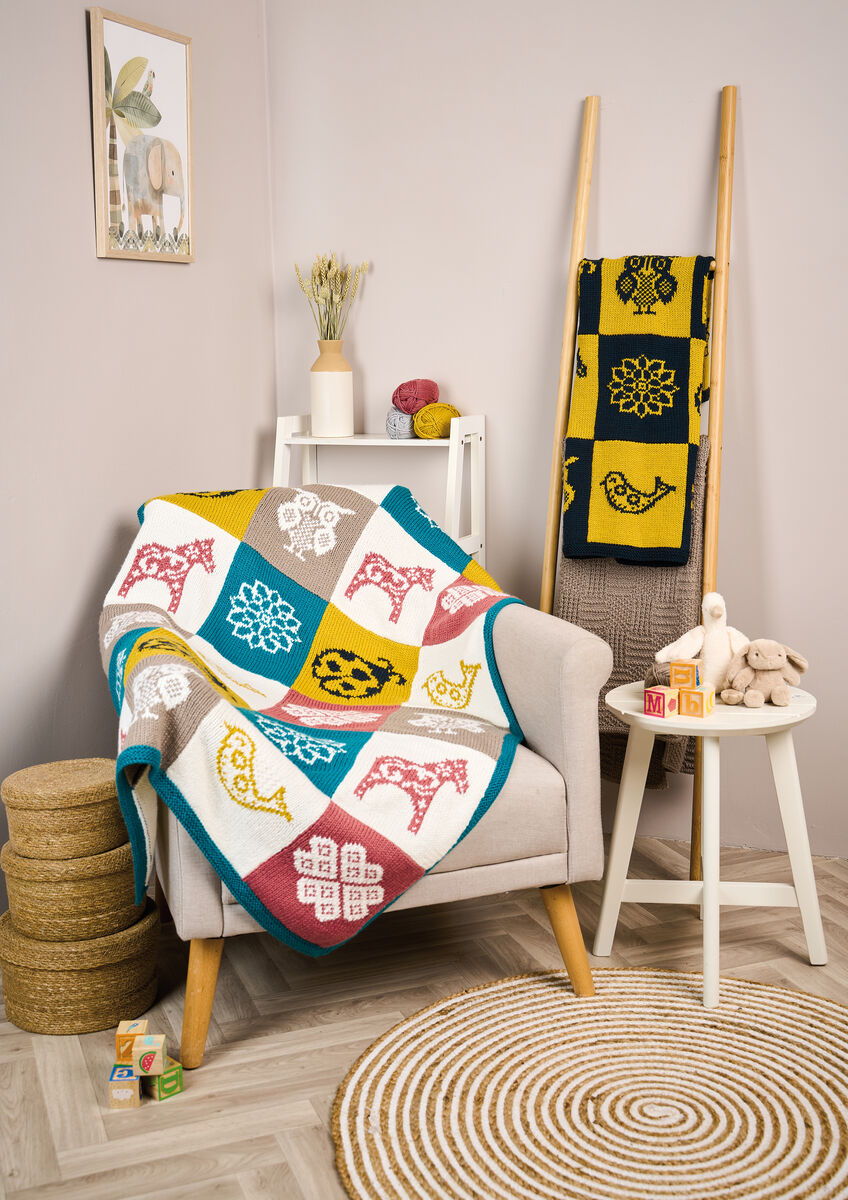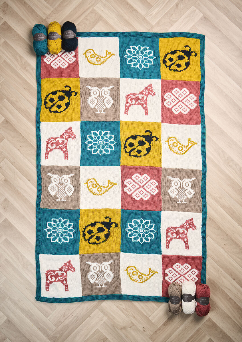 Martin Storey’s nature-inspired baby blanket is both visually stimulating and comforting, perfect for a nursery. The mix of animals and flowers appeals to baby’s curiosity, whilst the soft yarn and playful colours provide warmth and cosiness. Knitted in Baby Cashsoft Worsted, a beautiful cashmere and wool blend, choose from a six or two-colour version and three different sizes.